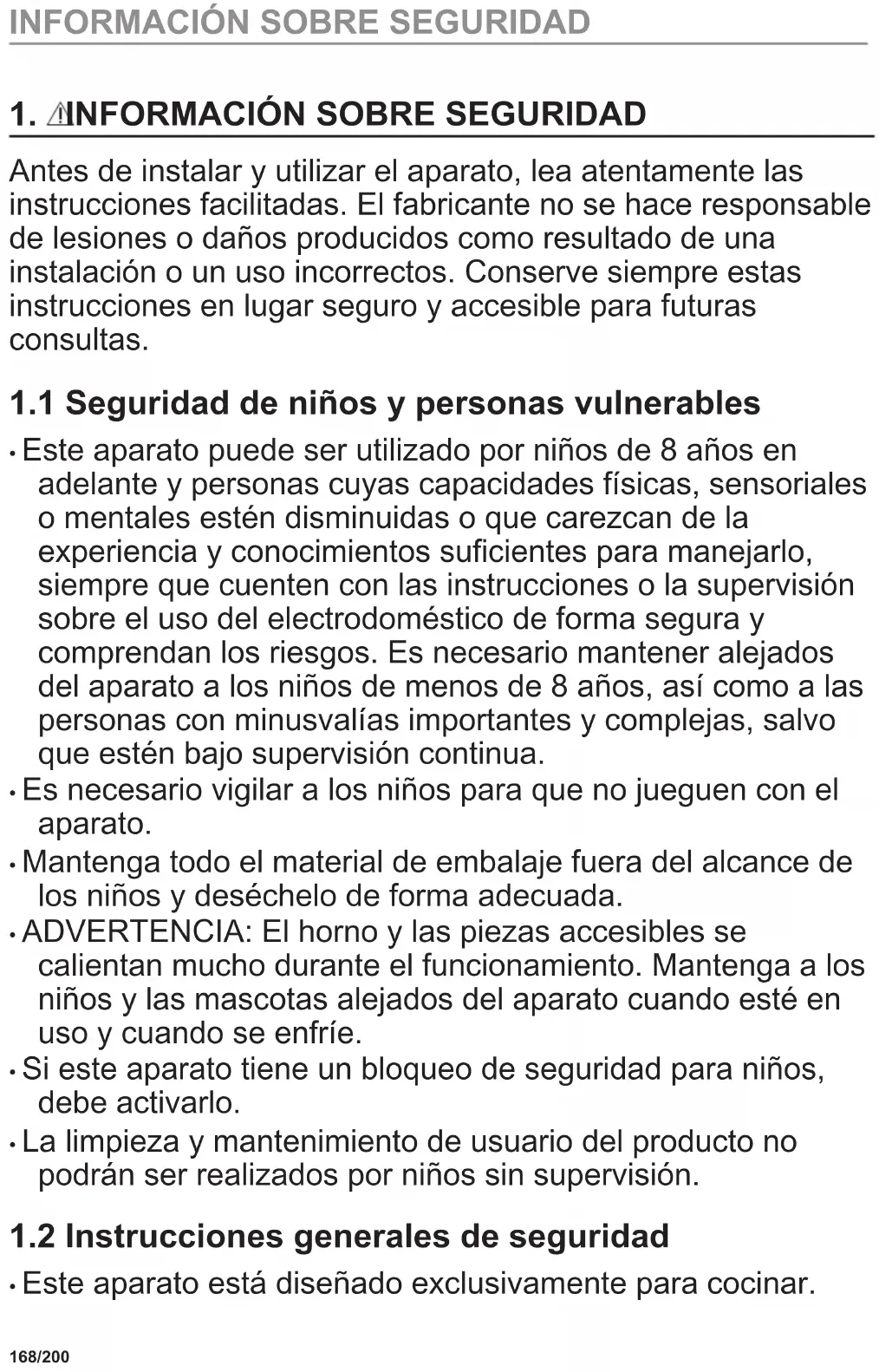 - Este aparato está diseñado exclusivamente para cocinar. 168/200 INFORMACIÓN SOBRE SEGURIDAD• Este aparato está diseñado para uso doméstico en interiores.