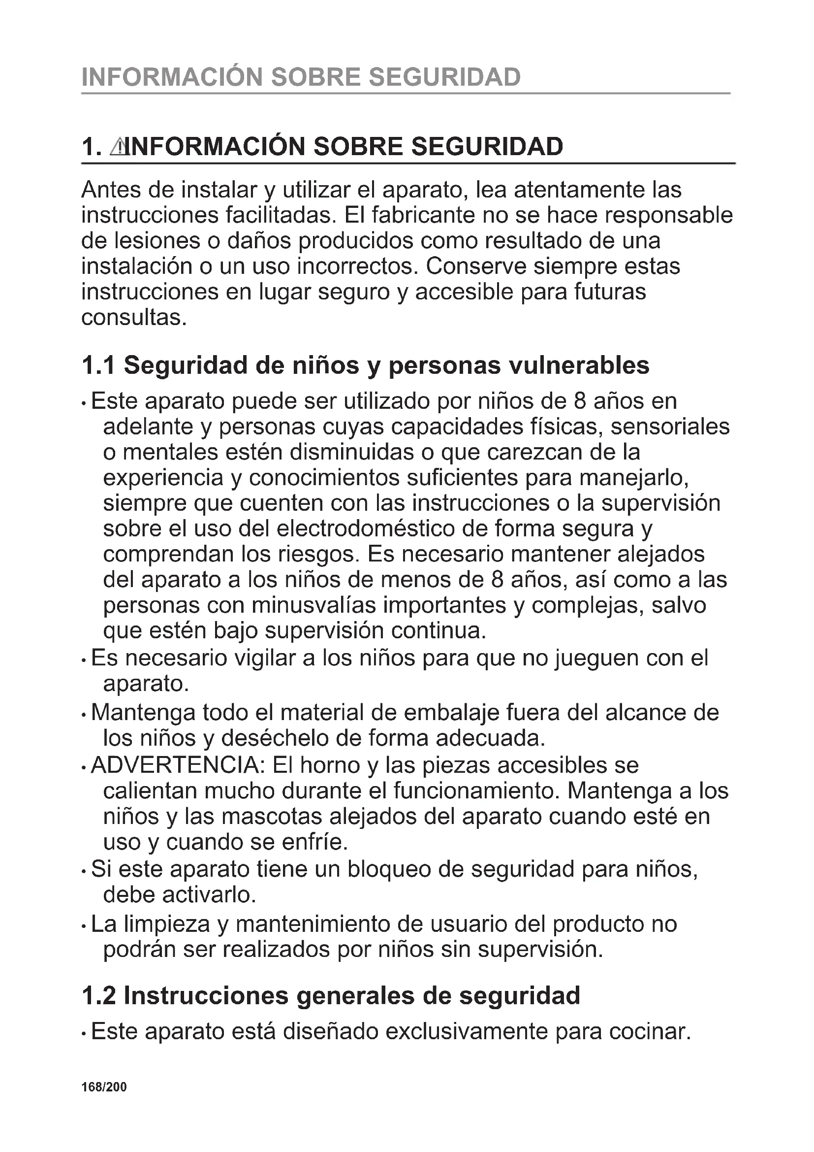 - Este aparato está diseñado exclusivamente para cocinar. 168/200 INFORMACIÓN SOBRE SEGURIDAD• Este aparato está diseñado para uso doméstico en interiores.