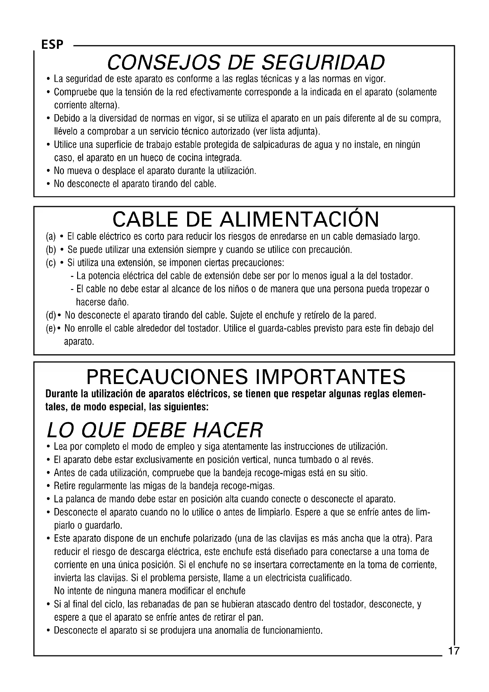 (a) • El cable eléctrico es corto para reducir los riesgos de enredarse en un cable demasiado largo.(b) • Se puede utilizar una extensión siempre y cuando se utilice con precaución.(c) • Si utiliza una extensión, se imponen ciertas precauciones:- La potencia eléctrica del cable de extensión debe ser por lo menos igual a la del tostador.- El cable no debe estar al alcance de los niños o de manera que una persona pueda tropezar ohacerse daño.(d)• No desconecte el aparato tirando del cable. Sujete el enchufe y retírelo de la pared.(e)• No enrolle el cable alrededor del tostador. Utilice el guarda-cables previsto para este fin debajo delaparato. PRECAUCIONES IMPORTANTES Durante la utilización de aparatos eléctricos, se tienen que respetar algunas reglas elemen- tales, de modo especial, las siguientes: