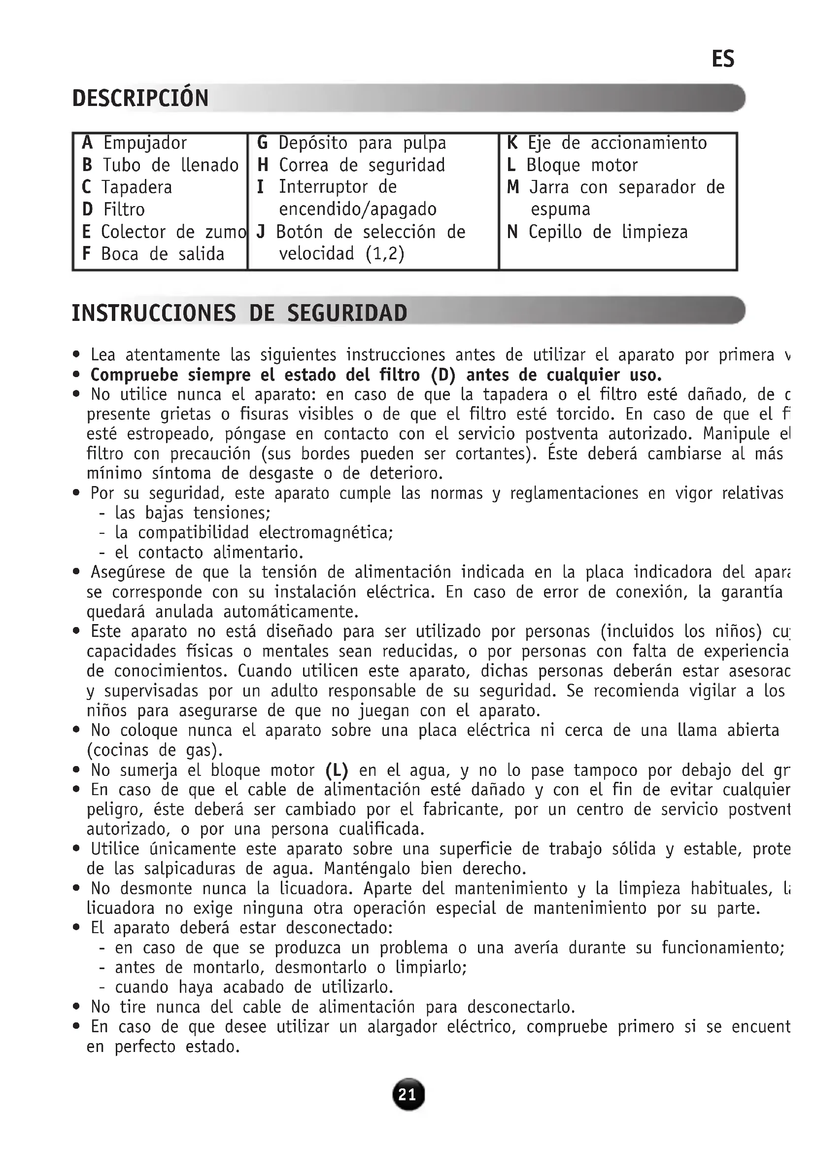 - No retire el depósito para pulpa (G) mientras que el aparato se encuentre en funcionamiento.