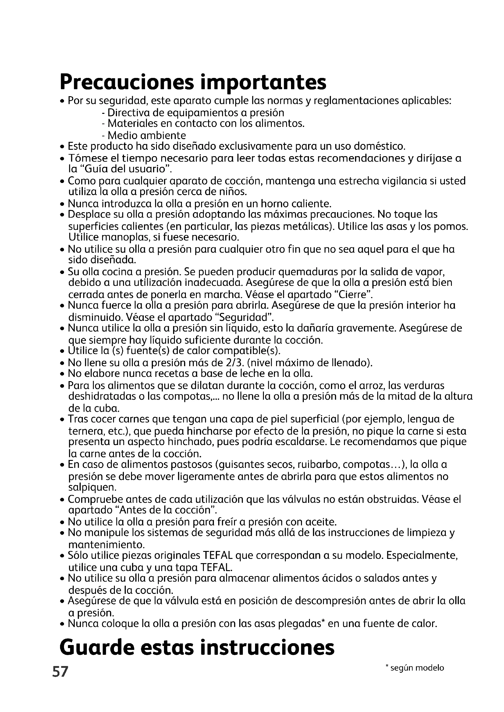 - según modelo Precauciones importantes