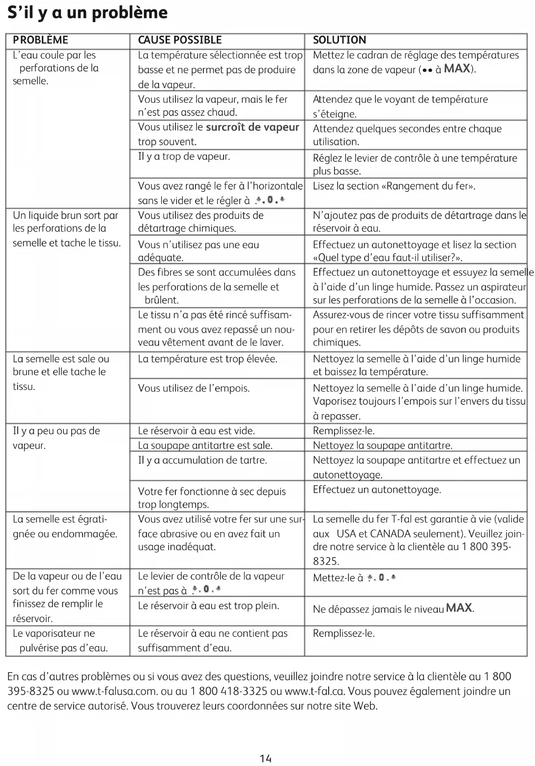El agua sale por los agujeros de la suela. La temperatura elegida no permite crear vapor. Utiliza vapor mientras que la plancha no está suficientemente caliente. Utiliza el botón de extra vapor demasiado a menudo. El caudal de vapor es demasiado importante. Ha guardado la plancha con la suela hacia abajo, sin vaciarla y sin poner el mando en . Ponga el termostato en la zona vapor (de •• a MAX). Espere a que el indicador luminoso se apague. Espere varios segundos entre cada utilización. Reduzca el caudal. Consulte el capítulo «Para guardar». Colores amarillentos salen de la suela y ensu- cian la ropa. Utiliza productos químicos contra los residuos calcáreos. No utiliza el tipo de agua adecuado. Fibras de ropa se han acumulado en los agujeros de la suela y se carboni- zan. La ropa no está suficientemente aclarada o ha planchado una prenda nueva antes de lavarla. No añada ningún producto contra los residuos calcáreos en el agua del depósito. Realice una auto-limpieza y consulte el capítulo"¿Qué agua utilizar?". Realice una auto-limpieza y limpie la suela con una esponja húmeda. Aspire de vez en cuando los agujeros de la suela. Asegúrese de que la ropa esté bien aclarada para eliminar los posibles depósitos de jabón o produc- tos químicos en la ropa nueva. La suela está sucia o amarillenta y puede ensuciar la ropa. Utiliza una temperatura demasiado elevada. Utiliza almidón. Limpie la suela con una esponja húmeda. Limpie la suela con una esponja húmeda. Pulverice almidón por el reverso de la tela a planchar. La plancha produce poco o nada de vapor. El depósito está vacío. La varilla antical está sucia. La plancha tiene residuos calcáreos. La plancha se ha utilizado demasiado tiempo en posición seca. Rellénelo con agua. Limpie la varilla antical. Limpie la varilla antical y haga funcionar la limpieza automática. Haga funcionar la limpieza automática. La suela está rayada o dañada. Usted planchó en una superficie abrasiva. Su plancha T-Fal incluye una garantía de tiempo de vida de su suela (vàlido solo en los EE-UU y CANADA). Por favor contáctenos en el departa- mento se Servicio al Cliente al 01-800-505-45-00, 01-800-112-83-25, 5283-93-00. La plancha pulveriza cuando se ha llenado el depósito. El cursor del mando de vapor. no está en la posición . El depósito de agua está lleno. Compruebe que el mando de vapor está en la posición . Nunca sobrepase el indicador de llenado MAX. La función spray no funciona.No hay suficiente agua en el depósito.Llene el depósito de agua.