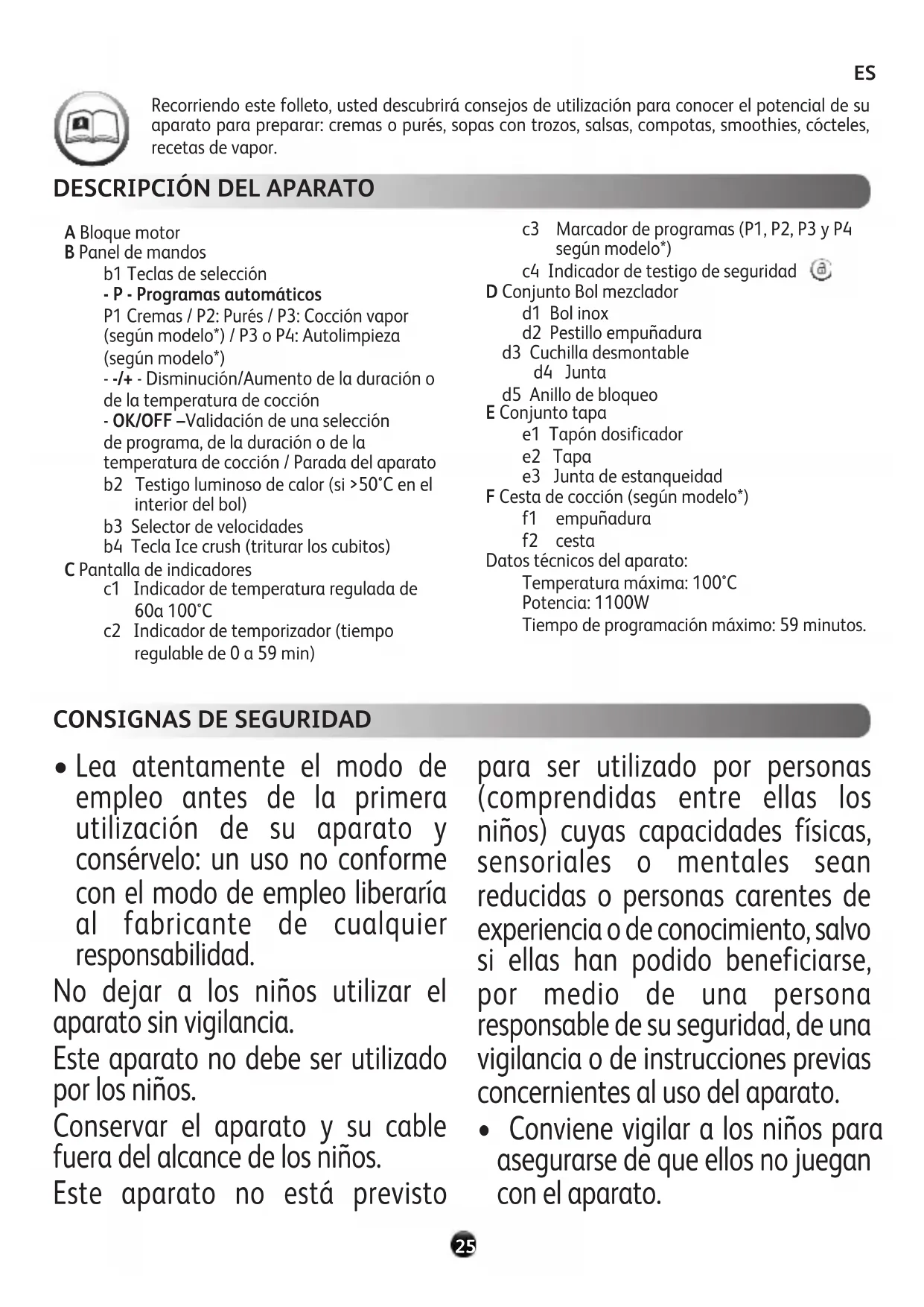 STARTSTART A Bloque motor B Panel de mandos b1 Teclas de selección - P - Programas automáticos P1 Cremas / P2: Purés / P3: Cocción vapor (según modelo*) / P3 o P4: Autolimpieza (según modelo*) - -/+ - Disminución/Aumento de la duración o de la temperatura de cocción - OK/OFF –Validación de una selección de programa, de la duración o de la temperatura de cocción / Parada del aparato b2 Testigo luminoso de calor (si >50°C en el interior del bol) b3 Selector de velocidades b4 Tecla Ice crush (triturar los cubitos) C Pantalla de indicadores c1 Indicador de temperatura regulada de 60a 100°C c2 Indicador de temporizador (tiempo regulable de 0 a 59 min) c3 Marcador de programas (P1, P2, P3 y P4 según modelo*) c4 Indicador de testigo de seguridad START START D Conjunto Bol mezclador d1 Bol inox d2 Pestillo empuñadura d3 Cuchilla desmontable d4 Junta d5 Anillo de bloqueo E Conjunto tapa e1 Tapón dosificador e2 Tapa e3 Junta de estanqueidad F Cesta de cocción (según modelo*) f1 empuñadura f2 cesta Datos técnicos del aparato: Temperatura máxima: 100°C Potencia: 1100W Tiempo de programación máximo: 59 minutos.