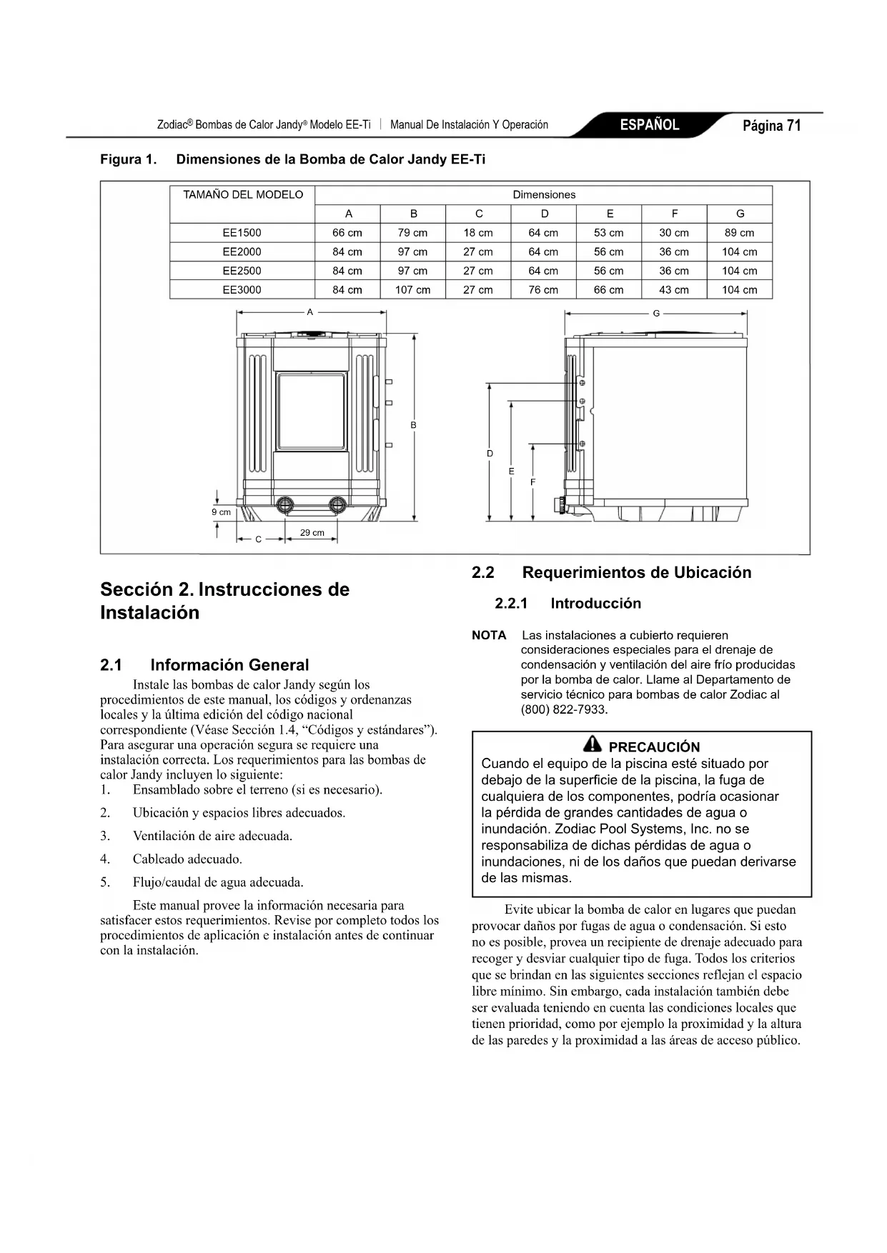 Estemanualproveeinstruccionesdeinstalacióny operaciónparalasbombasdecalorJandymodelosEE-Ti. Leatodaslasinstruccionesdeinstalaciónyoperaciónantes derealizarlainstalación.ConsulteaZodiacPoolSystem sitienepreguntasacercadeesteequipo.Paraobtenermás copiasdeestemanual,comuníqueseal(800)822-7933.A continuaciónseencuentraladireccióndeZodiac: ZodiacPoolSystem,Inc. 2620CommerceWay Vista,CA92081USA Estabombadecalorestáespecíficamentediseñada paracalentarpiscinasdenataciónyspas.Noutilizarcomo calentadordeserviciogeneral.Consulteasudistribuidor sobrelosproductosJandyadecuadosparaestasaplicaciones. “Las piscinas de natación y los spa” incluyen sistemas que utilizan unidades generadoras de agua salada y clorinada, como el generador electrónico de cloro AquaPure. Le rogamos se asegure de que el contenido salino en la piscina/spa no exceda las 4000 ppm y de que la tasa de ujo/medida del caudal de agua se encuentre entre los 30-125 gpm (110-475 lpm)