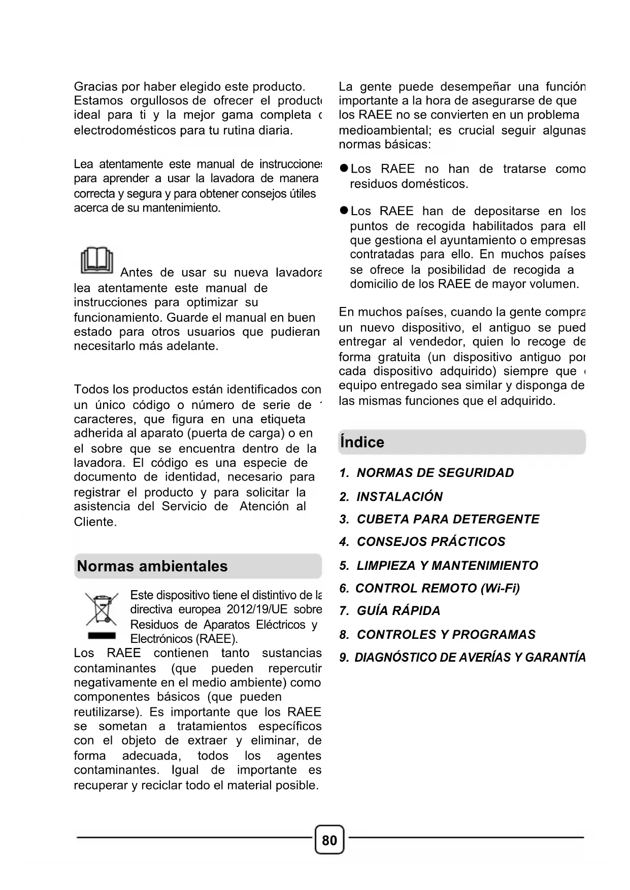 Gracias por haber elegido este producto. Estamos orgullosos de ofrecer el producto ideal para ti y la mejor gama completa de electrodomésticos para tu rutina diaria. Lea atentamente este manual de instrucciones para aprender a usar la lavadora de manera correcta y segura y para obtener consejos útiles acerca de su mantenimiento. Antes de usar su nueva lavadora, lea atentamente este manual de instrucciones para optimizar su funcionamiento. Guarde el manual en buen estado para otros usuarios que pudieran necesitarlo más adelante. Todos los productos están identificados con un único código o número de serie de 16 caracteres, que figura en una etiqueta adherida al aparato (puerta de carga) o en el sobre que se encuentra dentro de la lavadora. El código es una especie de documento de identidad, necesario para registrar el producto y para solicitar la asistencia del Servicio de Atención al Cliente.