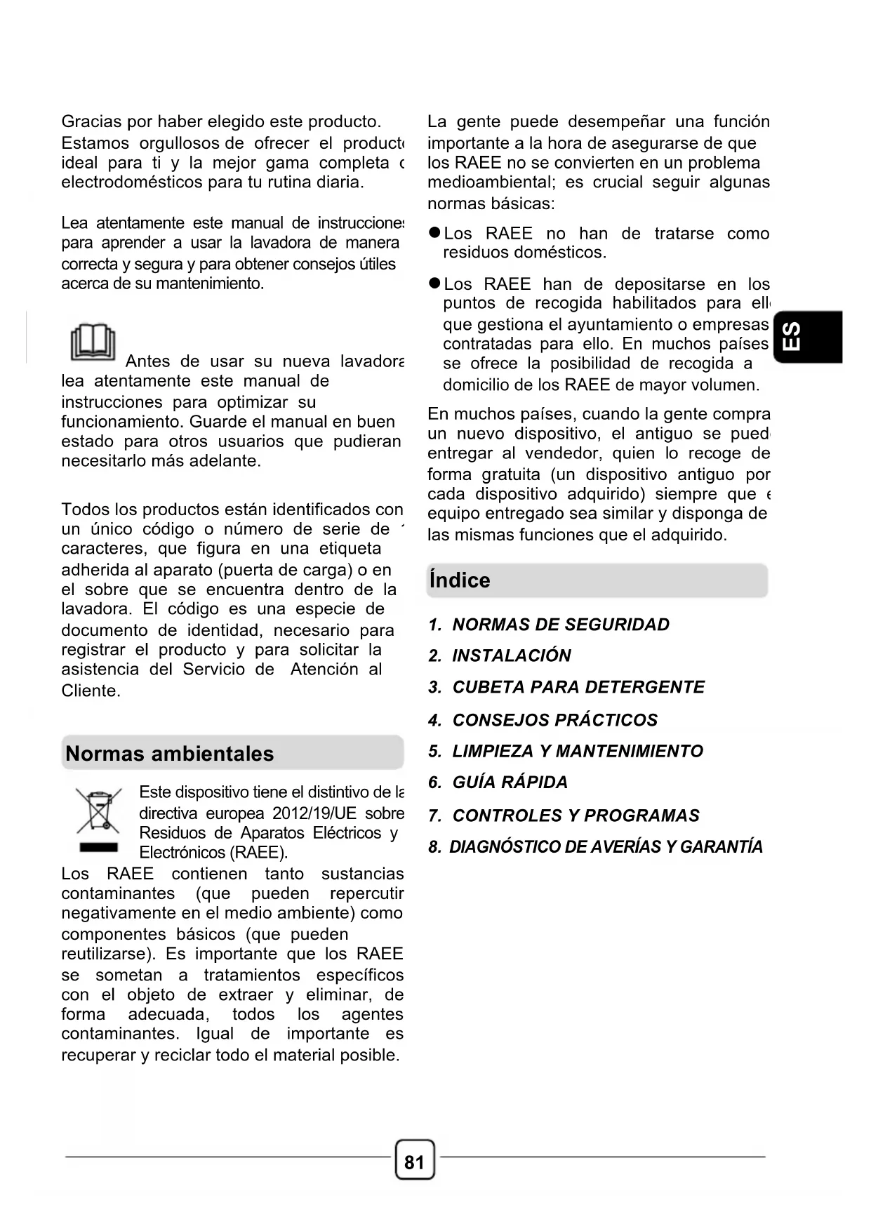 Gracias por haber elegido este producto. Estamos orgullosos de ofrecer el producto ideal para ti y la mejor gama completa de electrodomésticos para tu rutina diaria. Lea atentamente este manual de instrucciones para aprender a usar la lavadora de manera correcta y segura y para obtener consejos útiles acerca de su mantenimiento. Antes de usar su nueva lavadora, lea atentamente este manual de instrucciones para optimizar su funcionamiento. Guarde el manual en buen estado para otros usuarios que pudieran necesitarlo más adelante. Todos los productos están identificados con un único código o número de serie de 16 caracteres, que figura en una etiqueta adherida al aparato (puerta de carga) o en el sobre que se encuentra dentro de la lavadora. El código es una especie de documento de identidad, necesario para registrar el producto y para solicitar la asistencia del Servicio de Atención al Cliente.