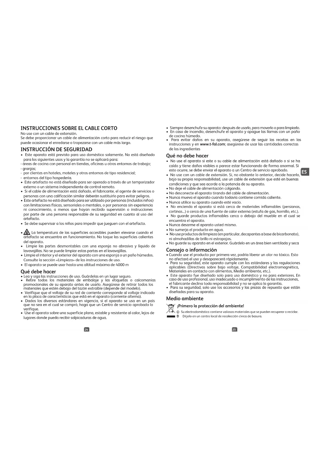 - Para evitar daños en su aparato, asegúrese de seguir las recetas en las instrucciones y en www.t-fal.com; asegúrese de usar las cantidades correctas de los ingredientes Qué no debe hacer