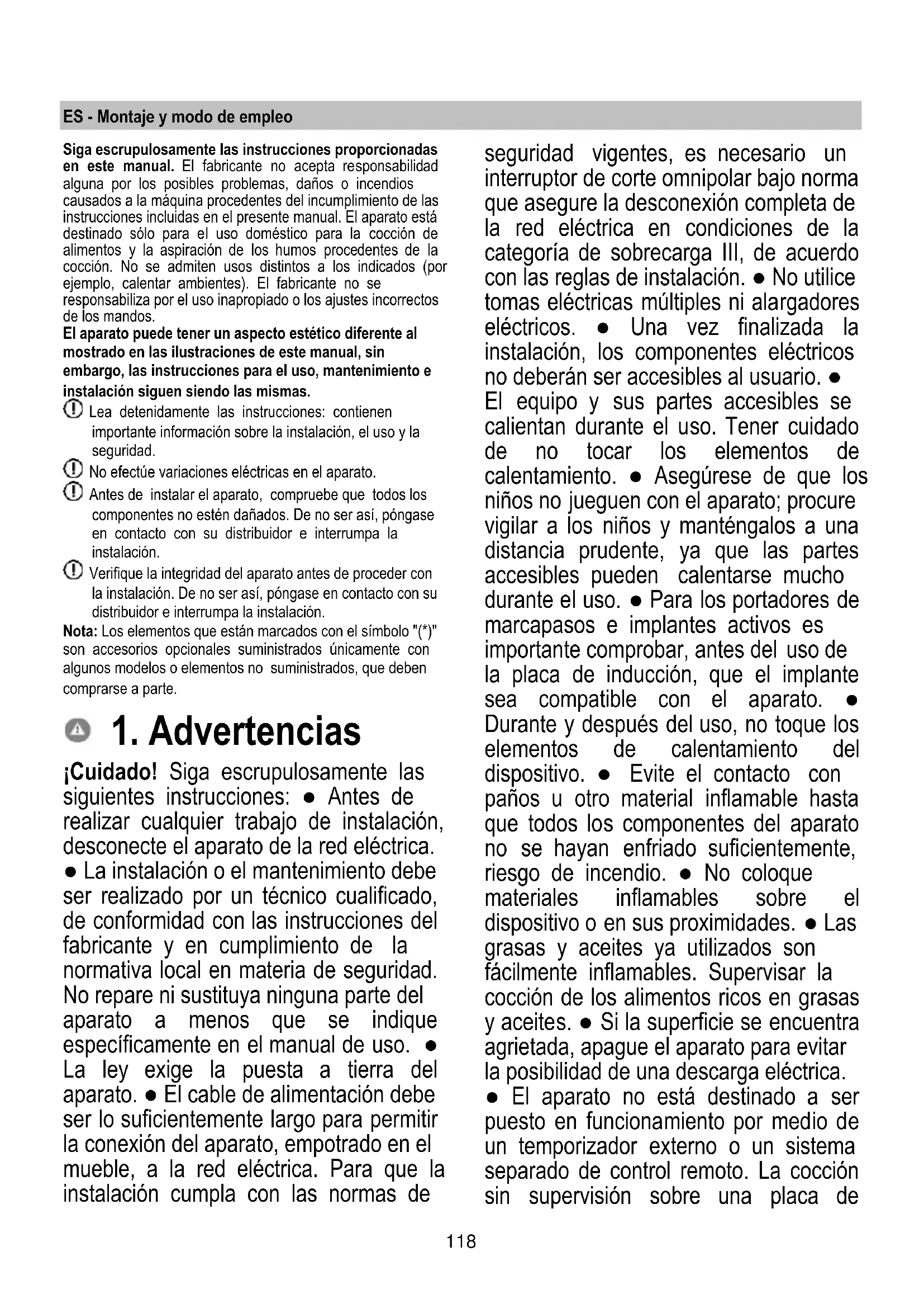 Als de storing na het uitvoeren van deze controles nog steeds aanwezig is, neem dan contact op met de dichtstbijzijnde Servicedienst.118 ES - Montaje y modo de empleo Siga escrupulosamente las instrucciones proporcionadas en este manual. El fabricante no acepta responsabilidad alguna por los posibles problemas, daños o incendios causados a la máquina procedentes del incumplimiento de las instrucciones incluidas en el presente manual. El aparato está destinado sólo para el uso doméstico para la cocción de alimentos y la aspiración de los humos procedentes de la cocción. No se admiten usos distintos a los indicados (por ejemplo, calentar ambientes). El fabricante no se responsabiliza por el uso inapropiado o los ajustes incorrectos de los mandos. El aparato puede tener un aspecto estético diferente al mostrado en las ilustraciones de este manual, sin embargo, las instrucciones para el uso, mantenimiento e instalación siguen siendo las mismas. Lea detenidamente las instrucciones: contienen importante información sobre la instalación, el uso y la seguridad. No efectúe variaciones eléctricas en el aparato. Antes de instalar el aparato, compruebe que todos los componentes no estén dañados. De no ser así, póngase en contacto con su distribuidor e interrumpa la instalación. Verifique la integridad del aparato antes de proceder con la instalación. De no ser así, póngase en contacto con su distribuidor e interrumpa la instalación. Nota: Los elementos que están marcados con el símbolo "(*)" son accesorios opcionales suministrados únicamente con algunos modelos o elementos no suministrados, que deben comprarse a parte.