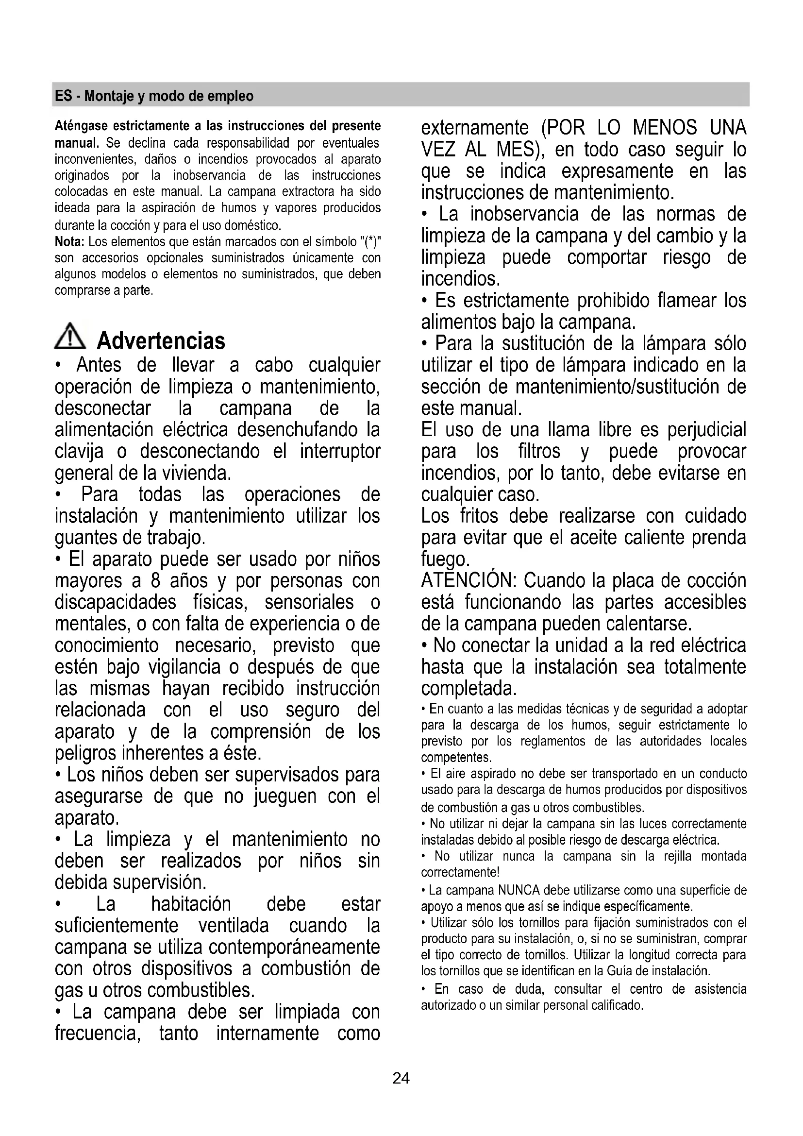 - La inobservancia de las normas de limpieza de la campana y del cambio y la limpieza puede comportar riesgo de incendios.