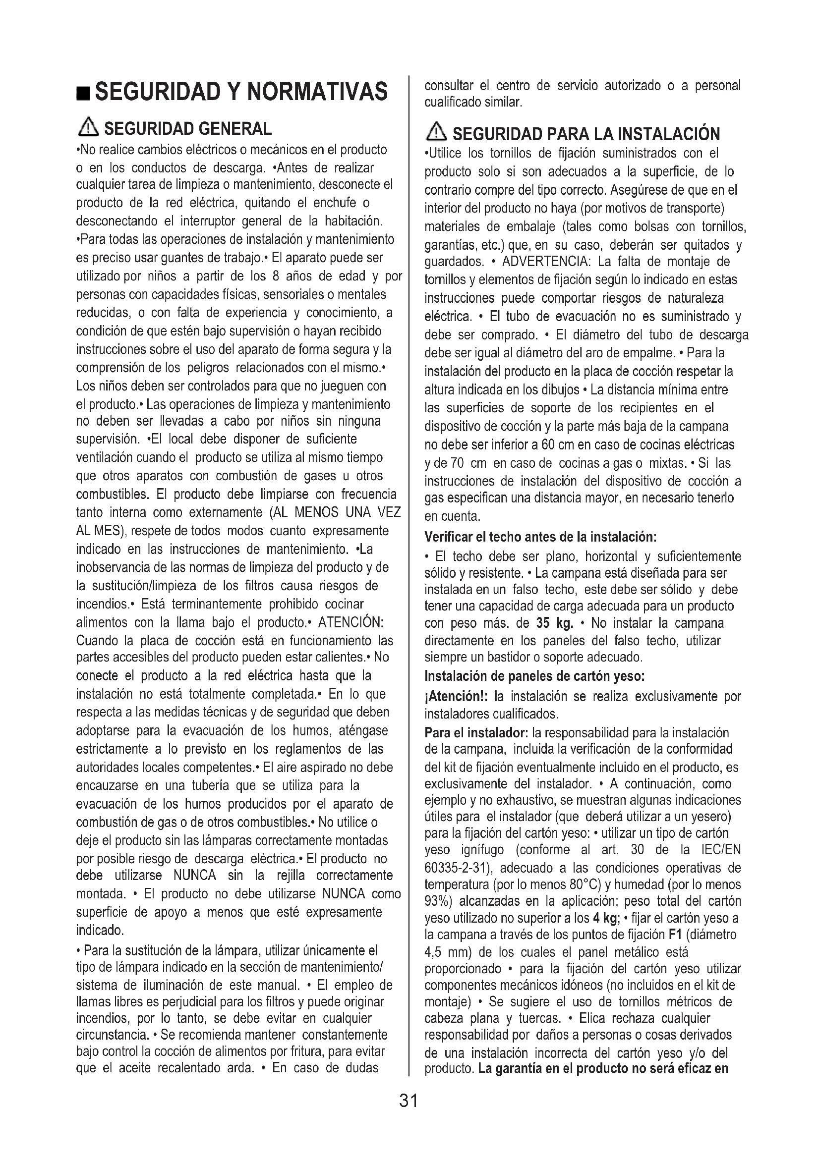 - Para todas las operaciones de instalación y mantenimiento es preciso usar guantes de trabajo.• El aparato puede ser utilizado por niños a partir de los 8 años de edad y por personas con capacidades físicas, sensoriales o mentales reducidas, o con falta de experiencia y conocimiento, a condición de que estén bajo supervisión o hayan recibido instrucciones sobre el uso del aparato de forma segura y la comprensión de los peligros relacionados con el mismo.• Los niños deben ser controlados para que no jueguen con el producto.• Las operaciones de limpieza y mantenimiento no deben ser llevadas a cabo por niños sin ninguna supervisión. •El local debe disponer de suficiente ventilación cuando el producto se utiliza al mismo tiempo que otros aparatos con combustión de gases u otros combustibles. El producto debe limpiarse con frecuencia tanto interna como externamente (AL MENOS UNA VEZ AL MES), respete de todos modos cuanto expresamente indicado en las instrucciones de mantenimiento. •La inobservancia de las normas de limpieza del producto y de la sustitución/limpieza de los filtros causa riesgos de incendios.• Está terminantemente prohibido cocinar alimentos con la llama bajo el producto.• ATENCIÓN: Cuando la placa de cocción está en funcionamiento las partes accesibles del producto pueden estar calientes.• No conecte el producto a la red eléctrica hasta que la instalación no está totalmente completada.• En lo que respecta a las medidas técnicas y de seguridad que deben adoptarse para la evacuación de los humos, aténgase estrictamente a lo previsto en los reglamentos de las autoridades locales competentes.• El aire aspirado no debe encauzarse en una tubería que se utiliza para la evacuación de los humos producidos por el aparato de combustión de gas o de otros combustibles.• No utilice o deje el producto sin las lámparas correctamente montadas por posible riesgo de descarga eléctrica.• El producto no debe utilizarse NUNCA sin la rejilla correctamente montada. • El producto no debe utilizarse NUNCA como superficie de apoyo a menos que esté expresamente indicado.