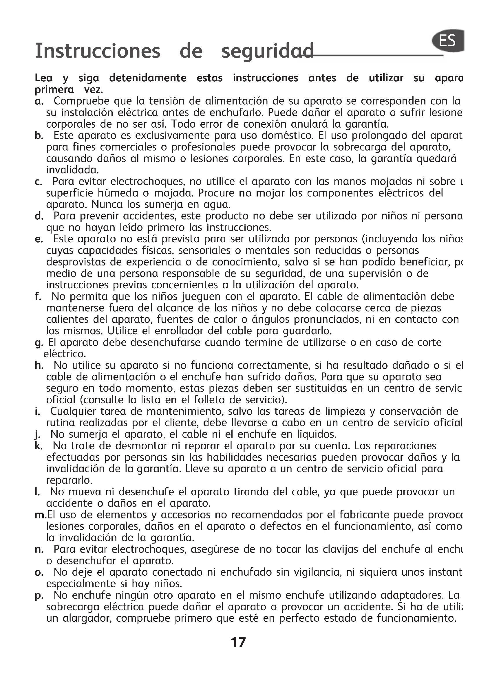 Aufbewahrung Verwenden Sie das Kabelfach für eine platzsparende Aufbewahrung (Abb. 2). Entsorgung elektrischer oder elektronischer Produkte Denken Sie an den Schutz der Umwelt! Ihr Gerät enthält wertvolle Rohstoffe, die wieder verwertet werden können. Geben Sie Ihr Gerät deshalb bitte bei einer Sammelstelle Ihrer Stadt oder Gemeinde ab.Instrucciones de seguridad Lea y siga detenidamente estas instrucciones antes de utilizar su aparato por primera vez. a. Compruebe que la tensión de alimentación de su aparato se corresponden con la de su instalación eléctrica antes de enchufarlo. Puede dañar el aparato o sufrir lesiones corporales de no ser así. Todo error de conexión anulará la garantía. b. Este aparato es exclusivamente para uso doméstico. El uso prolongado del aparato para fines comerciales o profesionales puede provocar la sobrecarga del aparato, causando daños al mismo o lesiones corporales. En este caso, la garantía quedará invalidada. c. Para evitar electrochoques, no utilice el aparato con las manos mojadas ni sobre una superficie húmeda o mojada. Procure no mojar los componentes eléctricos del aparato. Nunca los sumerja en agua. d. Para prevenir accidentes, este producto no debe ser utilizado por niños ni personas que no hayan leído primero las instrucciones. e. Este aparato no está previsto para ser utilizado por personas (incluyendo los niños) cuyas capacidades físicas, sensoriales o mentales son reducidas o personas desprovistas de experiencia o de conocimiento, salvo si se han podido beneficiar, por medio de una persona responsable de su seguridad, de una supervisión o de instrucciones previas concernientes a la utilización del aparato. f. No permita que los niños jueguen con el aparato. El cable de alimentación debe mantenerse fuera del alcance de los niños y no debe colocarse cerca de piezas calientes del aparato, fuentes de calor o ángulos pronunciados, ni en contacto con los mismos. Utilice el enrollador del cable para guardarlo. g. El aparato debe desenchufarse cuando termine de utilizarse o en caso de corte eléctrico. h. No utilice su aparato si no funciona correctamente, si ha resultado dañado o si el cable de alimentación o el enchufe han sufrido daños. Para que su aparato sea seguro en todo momento, estas piezas deben ser sustituidas en un centro de servicio oficial (consulte la lista en el folleto de servicio).