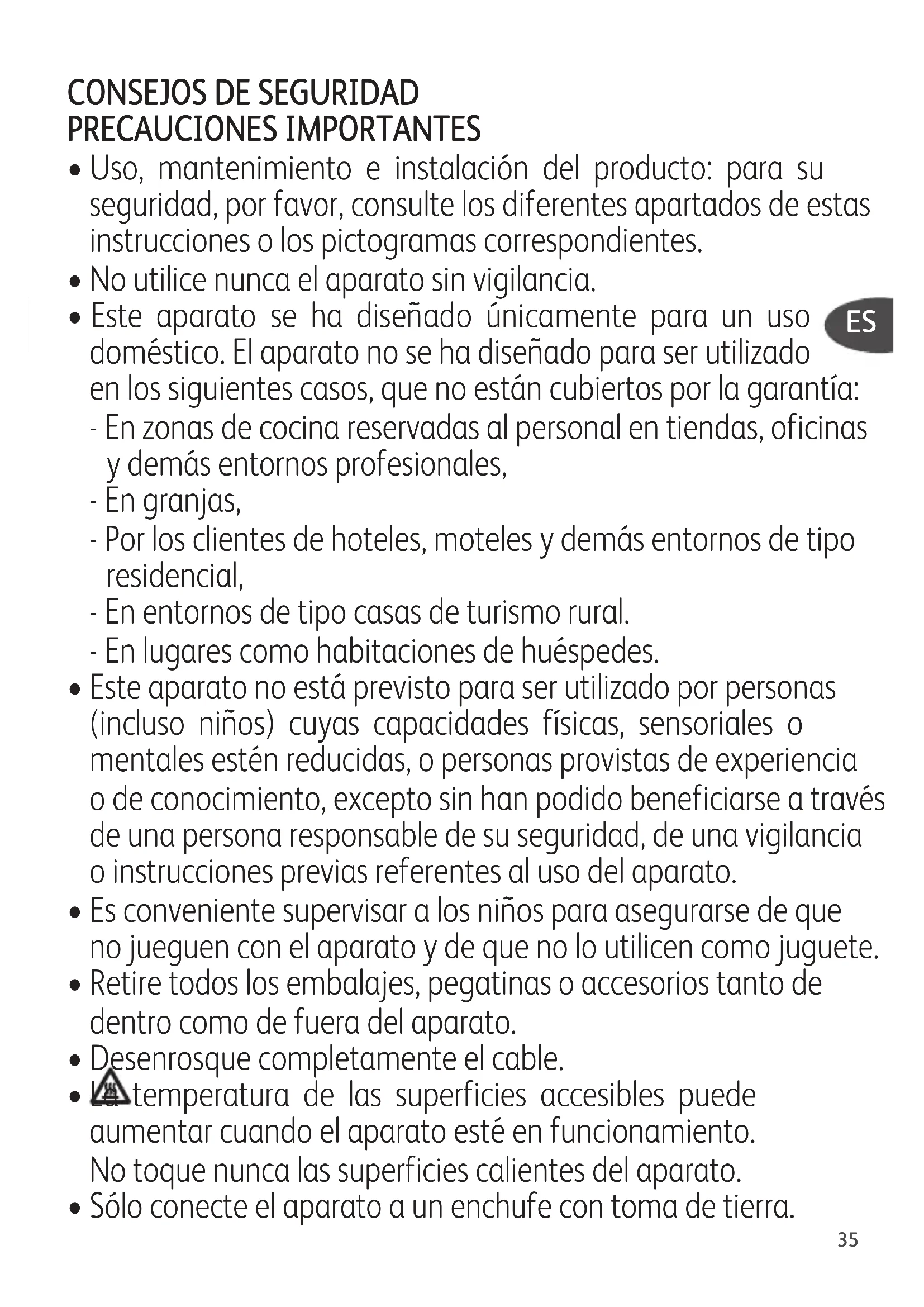 - La temperatura de las superficies accesibles puede aumentar cuando el aparato esté en funcionamiento. No toque nunca las superficies calientes del aparato.