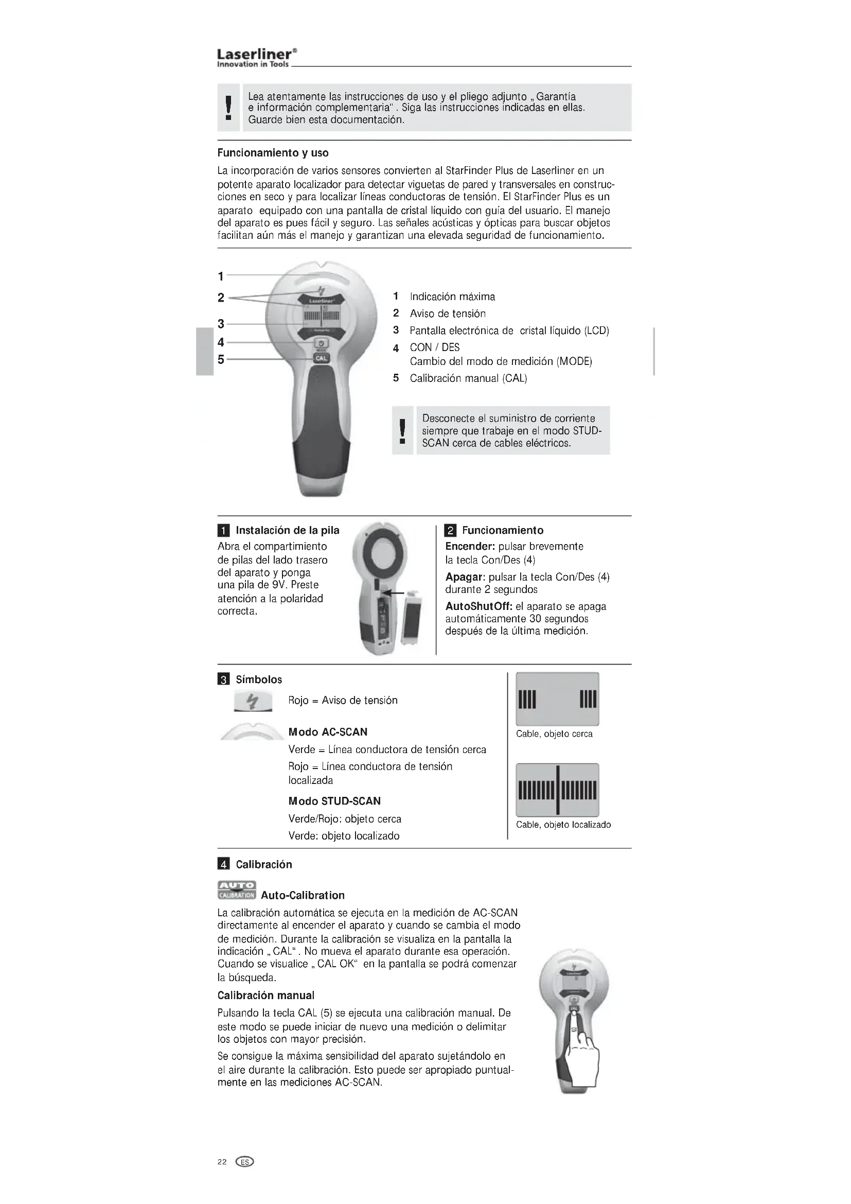 Funcionamiento y uso La incorporación de varios sensores convierten al StarFinder Plus de Laserliner en un potente aparato localizador para detectar viguetas de pared y transversales en construc- ciones en seco y para localizar líneas conductoras de tensión. El StarFinder Plus es un aparato equipado con una pantalla de cristal líquido con guía del usuario. El manejo del aparato es pues fácil y seguro. Las señales acústicas y ópticas para buscar objetos facilitan aún más el manejo y garantizan una elevada seguridad de funcionamiento. Indicación máxima Aviso de tensión Pantalla electrónica de cristal líquido (LCD) CON / DES Cambio del modo de medición (MODE) Calibración manual (CAL) Abra el compartimiento de pilas del lado trasero del aparato y ponga una pila de 9V. Preste atención a la polaridad correcta. Instalación de la pila Encender: pulsar brevemente la tecla Con/Des (4) Apagar: pulsar la tecla Con/Des (4) durante 2 segundos AutoShutOff: el aparato se apaga automáticamente 30 segundos después de la última medición. Funcionamiento Auto-Calibration La calibración automática se ejecuta en la medición de AC-SCAN directamente al encender el aparato y cuando se cambia el modo de medición. Durante la calibración se visualiza en la pantalla la indicación „CAL“. No mueva el aparato durante esa operación. Cuando se visualice „CAL OK“ en la pantalla se podrá comenzar la búsqueda. Calibración Calibración manual Pulsando la tecla CAL (5) se ejecuta una calibración manual. De este modo se puede iniciar de nuevo una medición o delimitar los objetos con mayor precisión. Se consigue la máxima sensibilidad del aparato sujetándolo en el aire durante la calibración. Esto puede ser apropiado puntual- mente en las mediciones AC-SCAN. Desconecte el suministro de corriente siempre que trabaje en el modo STUD- SCAN cerca de cables eléctricos.