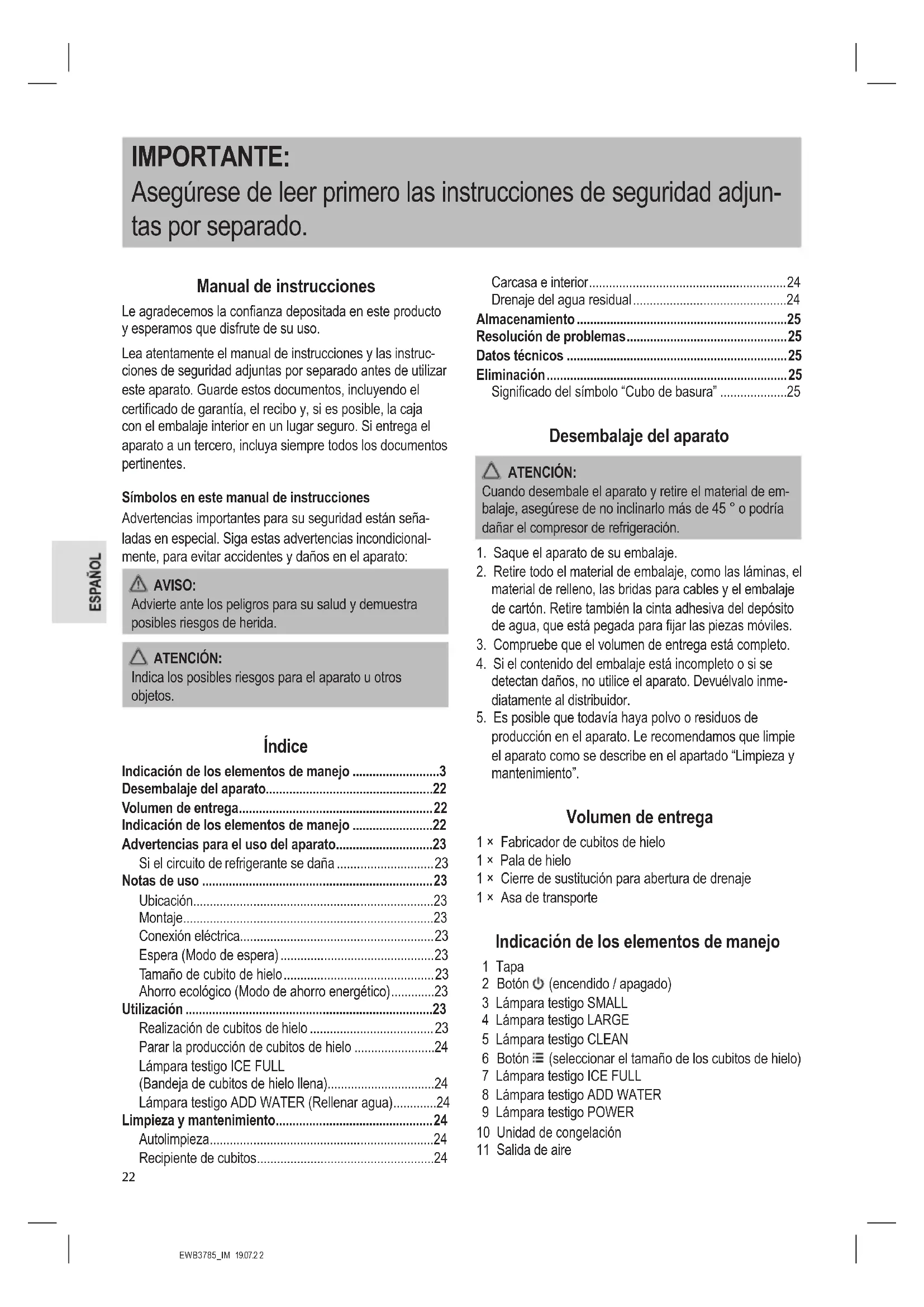 producción en el aparato. Le recomendamos que limpie el aparato como se describe en el apartado “Limpieza y mantenimiento”. Volumen de entrega 1 × Fabricador de cubitos de hielo 1 × Pala de hielo 1 × Cierre de sustitución para abertura de drenaje 1 × Asa de transporte Indicación de los elementos de manejo 1 Tapa 2 Botón (encendido / apagado) 3 Lámpara testigo SMALL 4 Lámpara testigo LARGE 5 Lámpara testigo CLEAN 6 Botón (seleccionar el tamaño de los cubitos de hielo) 7 Lámpara testigo ICE FULL 8 Lámpara testigo ADD WATER 9 Lámpara testigo POWER 10 Unidad de congelación 11 Salida de aireEWB3785_IM 19.07.2 2