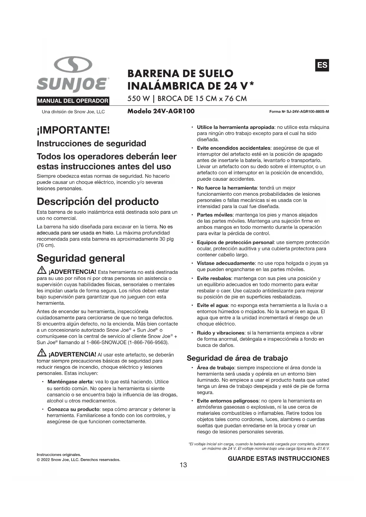 ENES Instrucciones originales.© 2022 Snow Joe, LLC. Derechos reservados.*El voltaje inicial sin carga, cuando la batería está cargada por completo, alcanza un máximo de 24 V. El voltaje nominal bajo una carga típica es de 21.6 V.