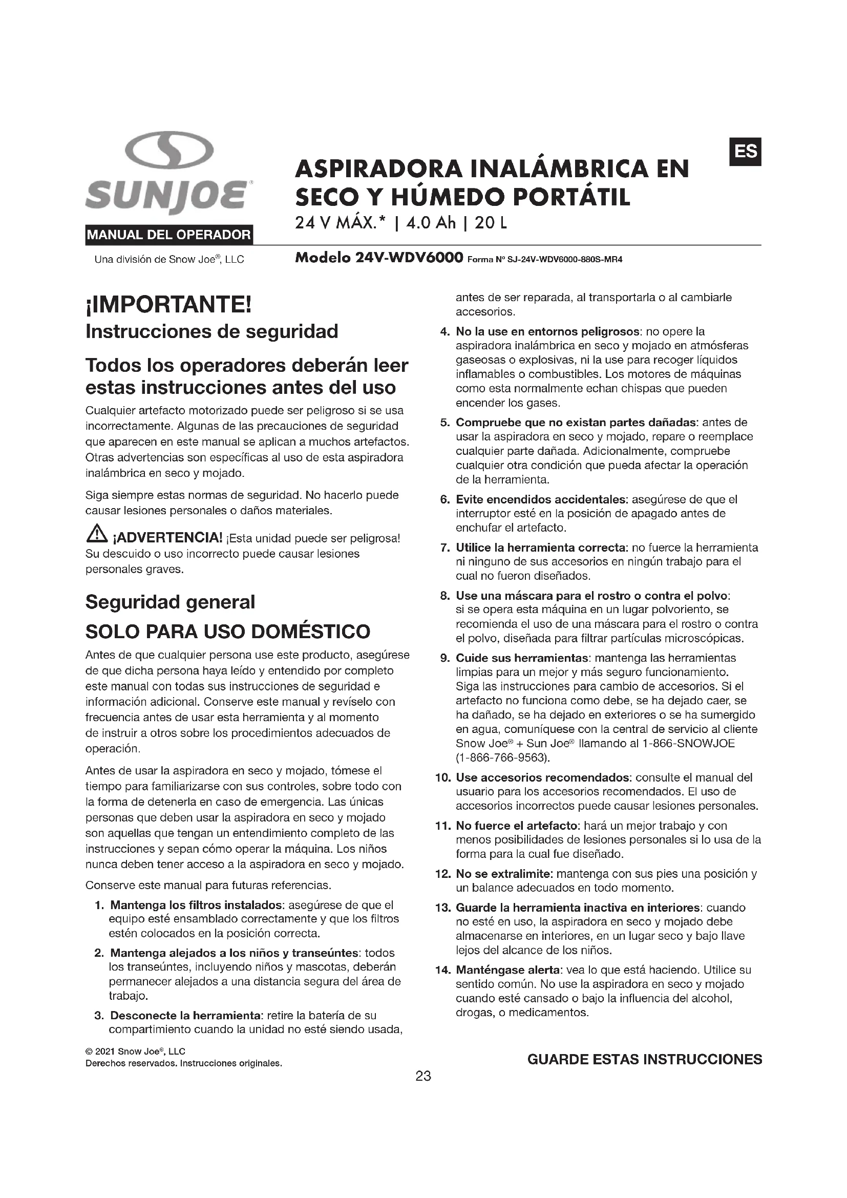 MANUAL DE USUARIO 24VWDV6000CT Sun Joe