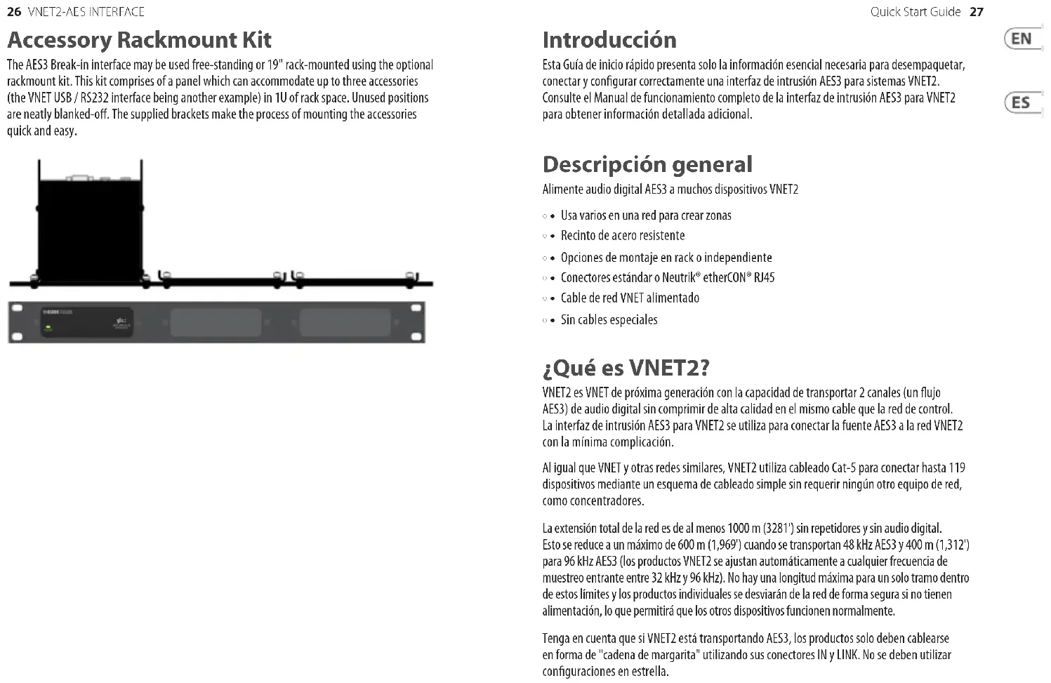 - • Sin cables especiales ¿Qué es VNET2? VNET2 es VNET de próxima generación con la capacidad de transportar 2 canales (un ujo AES3) de audio digital sin comprimir de alta calidad en el mismo cable que la red de control. La interfaz de intrusión AES3 para VNET2 se utiliza para conectar la fuente AES3 a la red VNET2 con la mínima complicación. Al igual que VNET y otras redes similares, VNET2 utiliza cableado Cat-5 para conectar hasta 119 dispositivos mediante un esquema de cableado simple sin requerir ningún otro equipo de red, como concentradores. La extensión total de la red es de al menos 1000 m (3281') sin repetidores y sin audio digital. Esto se reduce a un máximo de 600 m (1,969') cuando se transportan 48 kHz AES3 y 400 m (1,312') para 96 kHz AES3 (los productos VNET2 se ajustan automáticamente a cualquier frecuencia de muestreo entrante entre 32 kHz y 96 kHz). No hay una longitud máxima para un solo tramo dentro de estos límites y los productos individuales se desviarán de la red de forma segura si no tienen alimentación, lo que permitirá que los otros dispositivos funcionen normalmente. Tenga en cuenta que si VNET2 está transportando AES3, los productos solo deben cablearse en forma de "cadena de margarita" utilizando sus conectores IN y LINK. No se deben utilizar conguraciones en estrella. Accessory Rackmount Kit The AES3 Break-in interface may be used free-standing or 19" rack-mounted using the optional rackmount kit. This kit comprises of a panel which can accommodate up to three accessories (the VNET USB / RS232 interface being another example) in 1U of rack space. Unused positions are neatly blanked-o. The supplied brackets make the process of mounting the accessories quick and easy.28 29Quick Start GuideVNET2-AES INTERFACE Diagrama funcional Como se puede ver, los datos de control de VNET del conector IN se alimentan a los conectores LINK y OUT, por lo que desde el punto de vista de los datos, la unidad puede considerarse como un divisor en “Y”, algo que es útil por derecho propio. La unidad envía cualquier AES3 presente en el conector IN solo al conector LINK. AES3 para el conector OUT solo puede provenir del AES3 IN XLR. Conexiones ENTRADA DE VNET - La entrada de red VNET2 "encadenada" desde el dispositivo anterior. Transporta datos de control de red y también puede contener audio digital AES3 de dispositivos ascendentes. ENLACE neto - Esencialmente la misma señal que el conector Net IN. Esto se utiliza para pasar exactamente los mismos datos al siguiente dispositivo de la cadena, incluidos los canales de audio AES3 desde el ujo ascendente (NO los canales de audio insertados por esta interfaz de intrusión). Esto es útil cuando tiene una red troncal principal que se pasa de un dispositivo a otro, pero también desea "desconectar" una o más ramas que transportan diferentes canales de audio. Salida neta - Ésta es una copia de los datos de control de red en el conector Net IN, pero con cualquier AES3 reemplazado por el AES3 insertado en esta interfaz de intrusión. AES3 EN - Este conector XLR hembra pasa datos AES3 al conector RJ45 OUT. Compatibilidad TLa interfaz de intrusión AES3 es compatible con dispositivos VNET o VNET2. Sin embargo, solo los dispositivos VNET2 podrán aceptar los canales de audio digital como entradas de audio. Todos los datos de VNET2 (incluida la secuencia AES3) pasarán a través de un dispositivo VNET sin ningún problema y, por supuesto, el dispositivo VNET responderá al control en red como de costumbre. Aplicaciones Típicas En el caso más simple, la interfaz de intrusión se insertaría en la "cabeza" de la red, entre la interfaz en serie y los dispositivos. Los dos canales de audio AES3 estarán disponibles para todos los dispositivos de la red. Algunos dispositivos pueden congurarse para seleccionar un canal y algunos el otro canal. Dado que la interfaz de intrusión puede insertar nuevos canales de audio en la red sin afectar los canales ascendentes, es posible crear muchas zonas de audio agregando más interfaces de intrusión. Kit de accesorios para montaje en bastidor La interfaz AES3 Break-in se puede utilizar de forma independiente o montada en un bastidor de 19" con el kit de montaje en bastidor opcional. Este kit consta de un panel que puede acomodar hasta tres accesorios (la interfaz VNET USB / RS232 es otro ejemplo) en 1U de espacio de rack Las posiciones no utilizadas están perfectamente tachadas Los soportes suministrados hacen que el proceso de montaje de los accesorios sea rápido y fácil.30 31Quick Start GuideVNET2-AES INTERFACE Introduction Ce guide de démarrage rapide ne présente que les informations essentielles nécessaires pour déballer, connecter et congurer correctement une interface de rodage AES3 pour les systèmes VNET2. Veuillez consulter le manuel d’utilisation complet de l’interface de rodage AES3 pour VNET2 pour obtenir des informations détaillées supplémentaires. Aperçu Transmettez l’audio numérique AES3 à de nombreux appareils VNET2