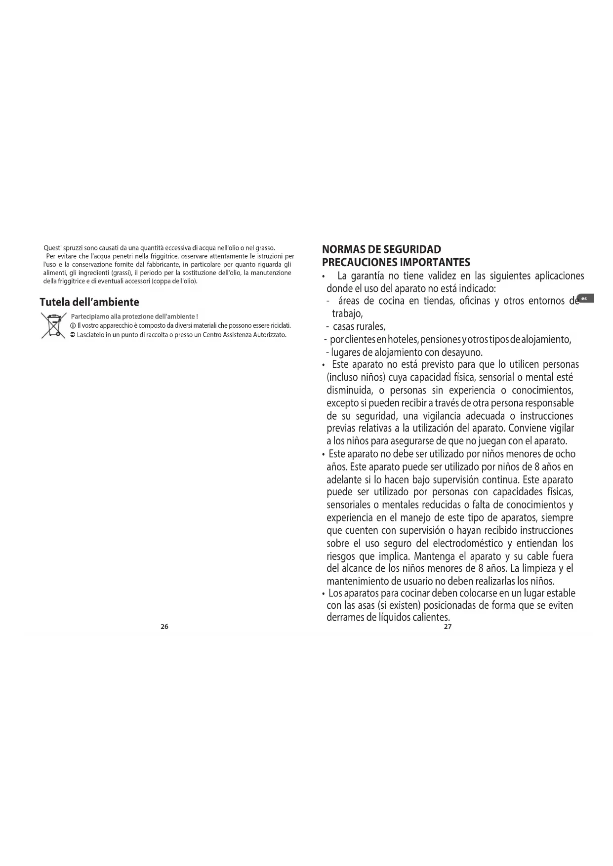 - Dado que el agua y el aceite no se pueden mezclar, se pueden producir salpicaduras que provoquen quemaduras graves cuando el aceite está calentándose, durante el ciclo de cocción o después de cocinar. Estas salpicaduras se producen si hay demasiada agua en el aceite o la grasa. Para evitar que entre agua en la freidora, respeta estrictamente las reglas de uso y almacenamiento proporcionadas por el fabricante, en especial las relacionadas con alimentos, ingredientes (sustancias grasas), cambio regular del aceite y mantenimiento de la freidora y los accesorios (sartén). Protección del medioambiente ¡ ¡ Participe en la conservación del medio ambiente ! ! i Su electrodoméstico contiene materiales recuperables y/o reciclables. Entréguelo al final de su vida útil, en un Centro de Recogida Específico o en uno de nuestros Servicios Oficiales Post Venta donde será tratado de forma adecuada.