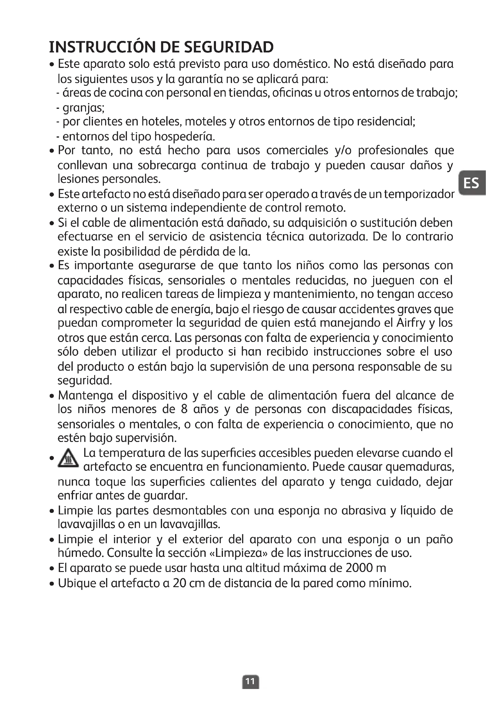 - Este aparato fue diseñado solo para uso doméstico y no para exteriores. En caso de uso profesional, uso inadecuado o incumplimiento de las instrucciones, el fabricante declina toda responsabilidad y no se aplica la garantía.
