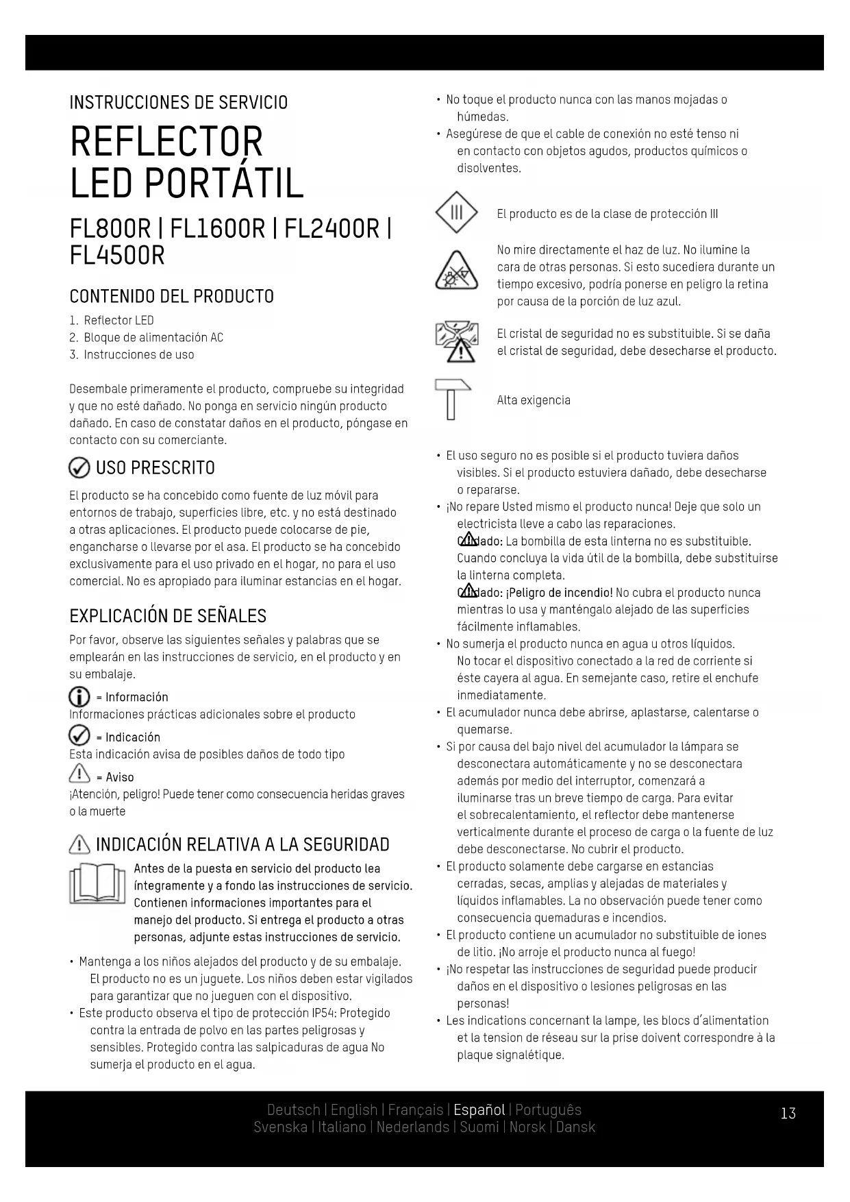 Desembale primeramente el producto, compruebe su integridad y que no esté dañado. No ponga en servicio ningún producto dañado. En caso de constatar daños en el producto, póngase en contacto con su comerciante. USO PRESCRITO El producto se ha concebido como fuente de luz móvil para entornos de trabajo, superficies libre, etc. y no está destinado a otras aplicaciones. El producto puede colocarse de pie, engancharse o llevarse por el asa. El producto se ha concebido exclusivamente para el uso privado en el hogar, no para el uso comercial. No es apropiado para iluminar estancias en el hogar.