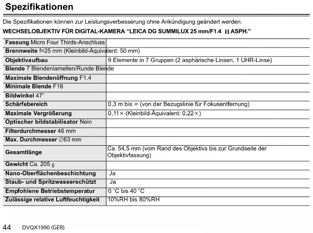Este es el sonido de la lente moviéndose y de la operación de apertura. No se trata de un funcionamiento defectuoso. H-XA025-DVQX1990.book 51 ページ 2019年9月2日 月曜日 午後7時17分52 DVQX1990 (SPA) Especificaciones Las especificaciones están sujetas a cambios para la mejora del rendimiento. ÓPTICA INTERCAMBIABLE PARA CÁMARA DIGITAL “LEICA DG SUMMILUX 25 mm/F1.4