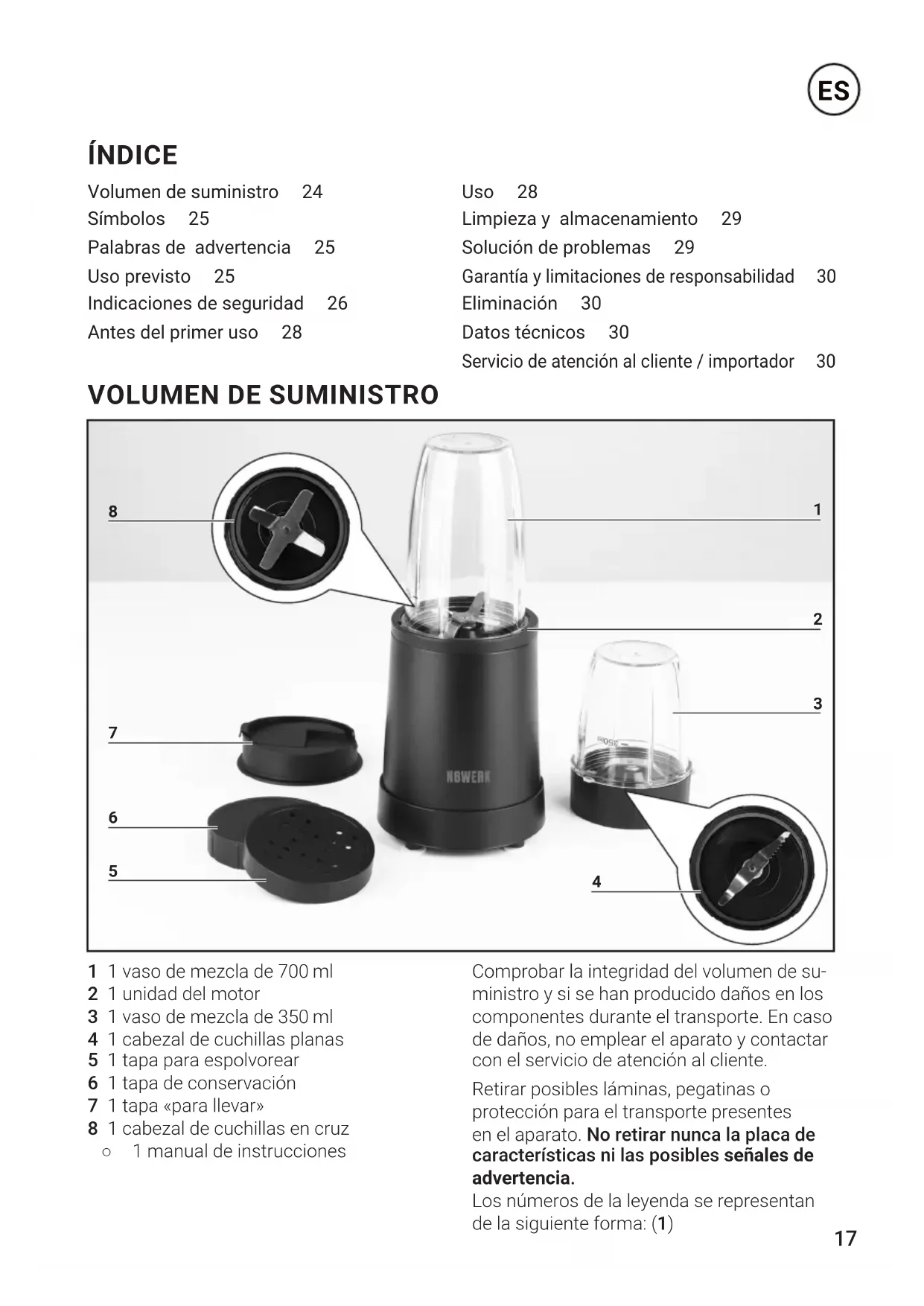 ÍNDICE Volumen de suministro 24 Símbolos 25 Palabras de advertencia 25 Uso previsto 25 Indicaciones de seguridad 26 Antes del primer uso 28 Uso 28 Limpieza y almacenamiento 29 Solución de problemas 29 Garantía y limitaciones de responsabilidad 30 Eliminación 30 Datos técnicos 30 Servicio de atención al cliente / importador 30