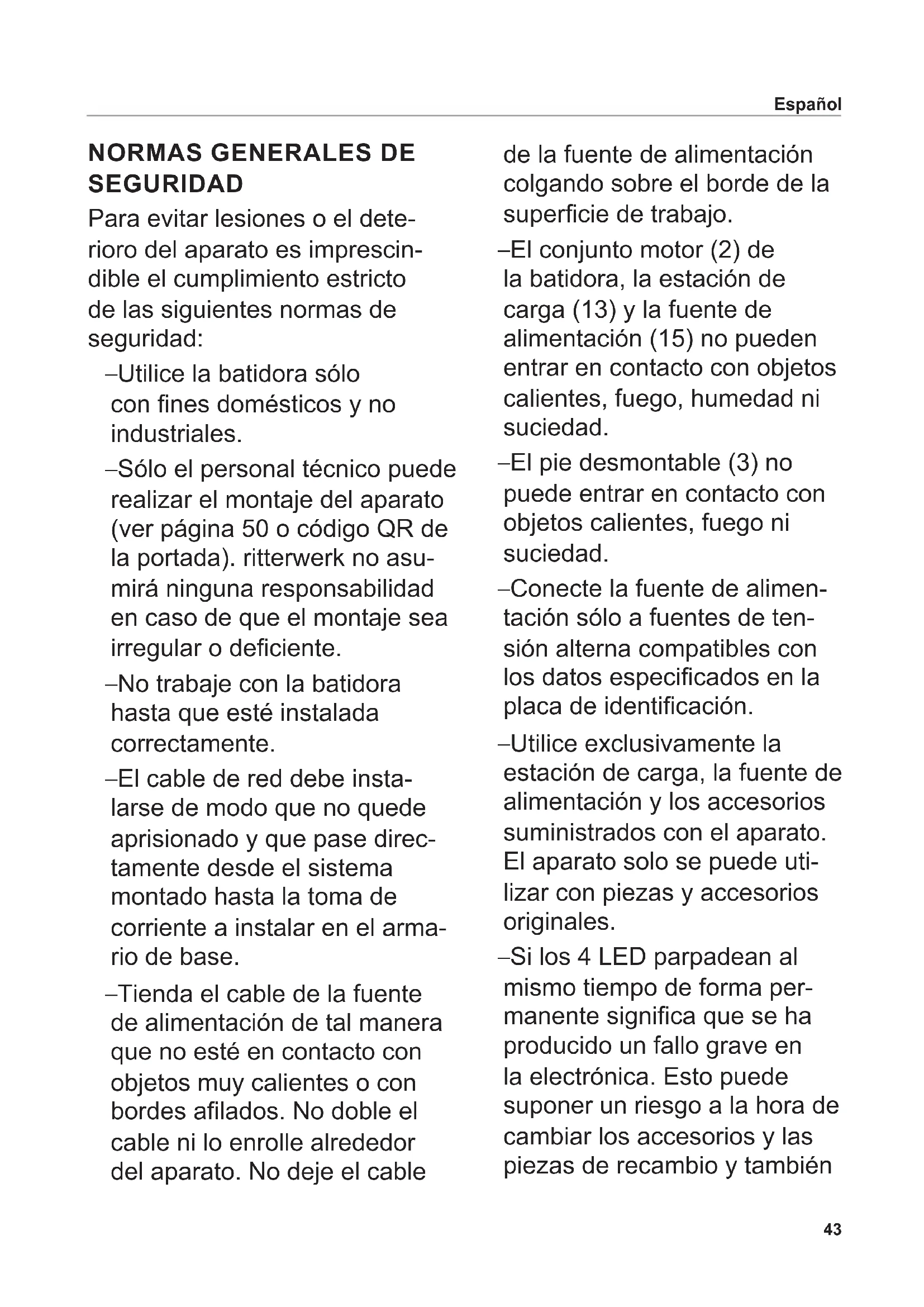 SEGURIDAD Para evitar lesiones o el dete- rioro del aparato es imprescin- dible el cumplimiento estricto de las siguientes normas de seguridad: – Utilice la batidora sólo con nes domésticos y no industriales. – Sólo el personal técnico puede realizar el montaje del aparato (ver página 50 o código QR de la portada). ritterwerk no asu- mirá ninguna responsabilidad en caso de que el montaje sea irregular o deciente. – No trabaje con la batidora hasta que esté instalada correctamente. – El cable de red debe insta- larse de modo que no quede aprisionado y que pase direc- tamente desde el sistema montado hasta la toma de corriente a instalar en el arma- rio de base. – Tienda el cable de la fuente de alimentación de tal manera que no esté en contacto con objetos muy calientes o con bordes alados. No doble el cable ni lo enrolle alrededor del aparato. No deje el cable de la fuente de alimentación colgando sobre el borde de la supercie de trabajo. – El conjunto motor (2) de la batidora, la estación de carga (13) y la fuente de alimentación (15) no pueden entrar en contacto con objetos calientes, fuego, humedad ni suciedad. – El pie desmontable (3) no puede entrar en contacto con objetos calientes, fuego ni suciedad. – Conecte la fuente de alimen- tación sólo a fuentes de ten- sión alterna compatibles con los datos especicados en la placa de identicación. – Utilice exclusivamente la estación de carga, la fuente de alimentación y los accesorios suministrados con el aparato. El aparato solo se puede uti- lizar con piezas y accesorios originales. – Si los 4 LED parpadean al mismo tiempo de forma per- manente signica que se ha producido un fallo grave en la electrónica. Esto puede suponer un riesgo a la hora de cambiar los accesorios y las piezas de recambio y también Español44 durante la limpieza. Apague el aparato inmediatamente y mándelo a revisar a un centro de servicio técnico autorizado. No toque los accesorios bajo ningún concepto. En este caso ya no se puede cargar la batería. – Este aparato no puede ser utilizado por niños. Mantenga fuera del alcance de los niños el aparato y su cable de conexión. – El aparato también puede ser utilizado por personas con disminución de sus facultades físicas, sensoriales o psíqui- cas o por personas inexpertas siempre y cuando lo hagan bajo supervisión o se les haya instruido sobre la manipu- lación segura del aparato y sobre sus posibles riesgos. – Impida que los niños jueguen con el aparato. – Ponga en marcha la batidora solo cuando se encuentre en el interior de un recipiente con el fondo plano. – No introduzca la batidora en el alimento por encima de la unión entre el conjunto motor y el pie desmontable. – Vigile el aparato en todo momento cuando esté funcionando. – No sumerja nunca la bati- dora, la estación de carga ni la fuente de alimentación en agua ni en otros líquidos. No exponga nunca el aparato a la acción de la lluvia o de la humedad. Si el aparato hubiera caído al agua, primero desenchufe la fuente de ali- mentación de la estación de carga y después sáquelo del agua. Antes de volver a poner en funcionamiento el aparato, asegúrese de que lo revisa a fondo un servicio técnico autorizado. – No utilice el aparato con las manos húmedas. No lo utilice si está húmedo o mojado, o bien si usted se encuentra en un suelo húmedo. No utilice el aparato al aire libre. – Ni la batidora ni la estación de carga se pueden lavar en el lavavajillas. – Cuando la batidora está en marcha no toque nunca los accesorios ni introduzca en ellos ningún objeto. Español45 Riesgo de lesiones – Desenchufe siempre la fuente de alimentación de la toma de corriente en caso de fallos en el funcionamiento. Para ello tire del cuerpo del enchufe, no del cable. – En caso de desperfecto o avería en alguna pieza del aparato, desconéctelo inme- diatamente para evitar ries- gos. Antes de volver a poner en funcionamiento el aparato, asegúrese de que lo revisa a fondo un servicio técnico autorizado. – Si la fuente de alimentación o el cable de ésta está dañado deberá cambiar la fuente de alimentación por otra original que deberá solicitar al fabri- cante o a su servicio técnico autorizado en su país. – No encienda la batidora bajo ningún concepto cuando la esté limpiando, cuando retire o coloque las cuchillas o cuando cambie los accesorios y las piezas de recambio. Mantenga los dedos alejados de los botones. No toque los los de las cuchillas porque están muy aladas. Español – Mientras bate los alimentos pueden producirse salpicadu- ras. Para evitar escaldaduras deje que los alimentos se enfríen antes de procesarlos. – Retire la olla de la placa de cocción si va a utilizar la bati- dora en su interior. – Asegúrese de que la muesca de los accesorios encaja com- pletamente en la espiga del eje. Los accesorios que no se jan bien y quedan sueltos no se pueden utilizar y hay que cambiarlos. Peligro de explosión – Proteja las baterías del calor y del fuego.46 Despliegue los grácos de la cubierta anterior y posterior. Lea atentamente las instruccio- nes antes de poner en marcha el aparato. Conserve las instruccio- nes de uso y adjúntelas cuando entregue el aparato a una tercera persona. La versión actualizada de las ins- trucciones de uso se encuentra disponible en www.ritterwerk.de. FIN PREVISTO La batidora sirve para hacer purés, picar y mezclar alimentos comunes que sean apropiados. Esta batidora es apta para el contacto con alimentos. Utilice la batidora sólo con nes domésticos y no industriales. Un uso distinto del previsto o una utilización incorrecta puede provocar lesiones graves o daños en la batidora. Además, anula cualquier derecho de garantía y de reclamación de responsabilidad. FUNCIONES Con esta batidora accionada por batería se pueden hacer purés, picar y mezclar alimentos sólidos y líquidos. La batidora (1) se entrega con un vaso de m