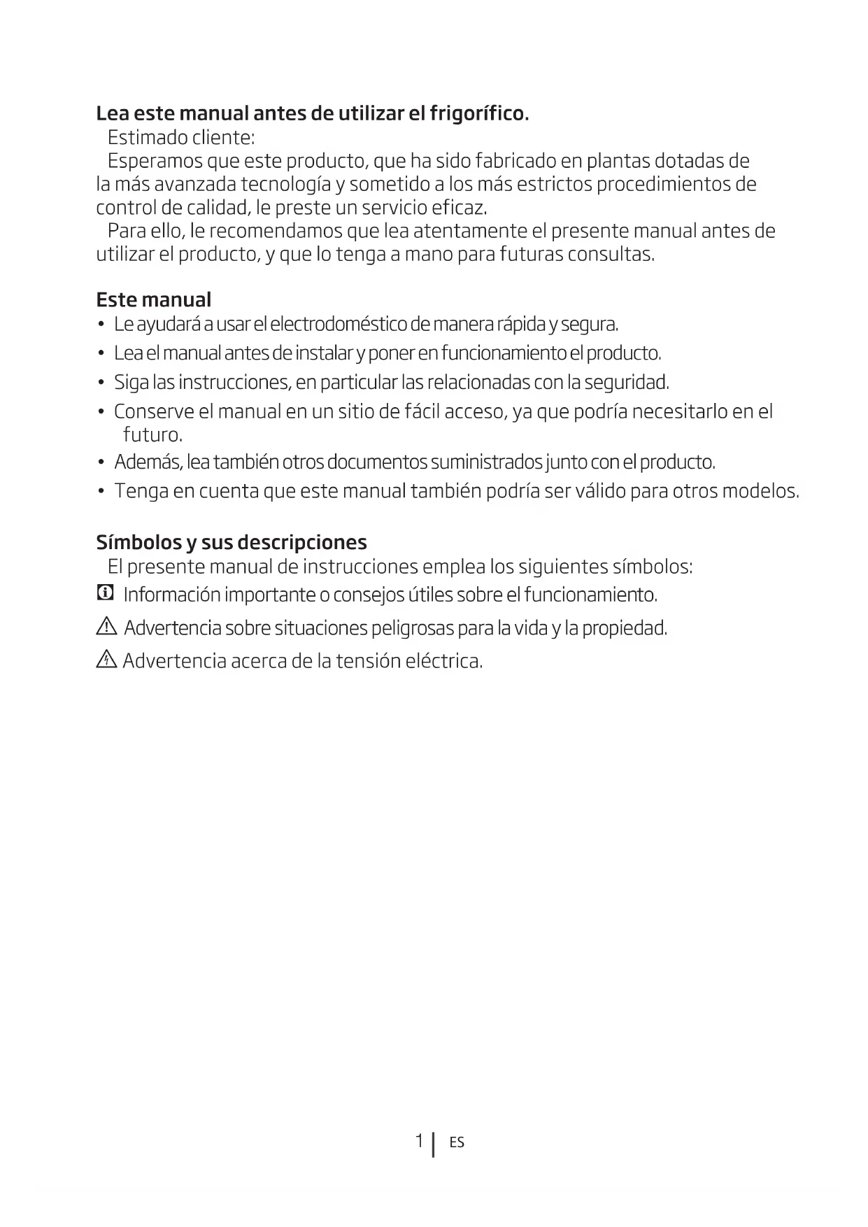 Lea este manual antes de utilizar el frigorífico. Estimado cliente: Esperamos que este producto, que ha sido fabricado en plantas dotadas de la más avanzada tecnología y sometido a los más estrictos procedimientos de control de calidad, le preste un servicio eficaz. Para ello, le recomendamos que lea atentamente el presente manual antes de utilizar el producto, y que lo tenga a mano para futuras consultas. Este manual