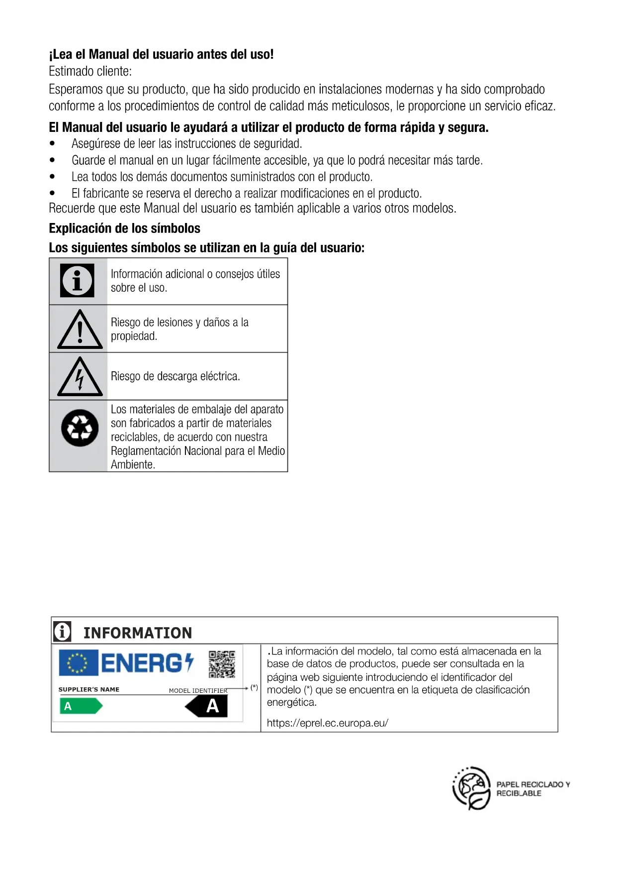 Información adicional o consejos útiles sobre el uso. Riesgo de lesiones y daños a la propiedad. Riesgo de descarga eléctrica.Los materiales de embalaje del aparato son fabricados a partir de materiales reciclables, de acuerdo con nuestra Reglamentación Nacional para el Medio Ambiente. .La información del modelo, tal como está almacenada en la base de datos de productos, puede ser consultada en la página web siguiente introduciendo el identificador del modelo (*) que se encuentra en la etiqueta de clasificación energética.https://eprel.ec.europa.eu/