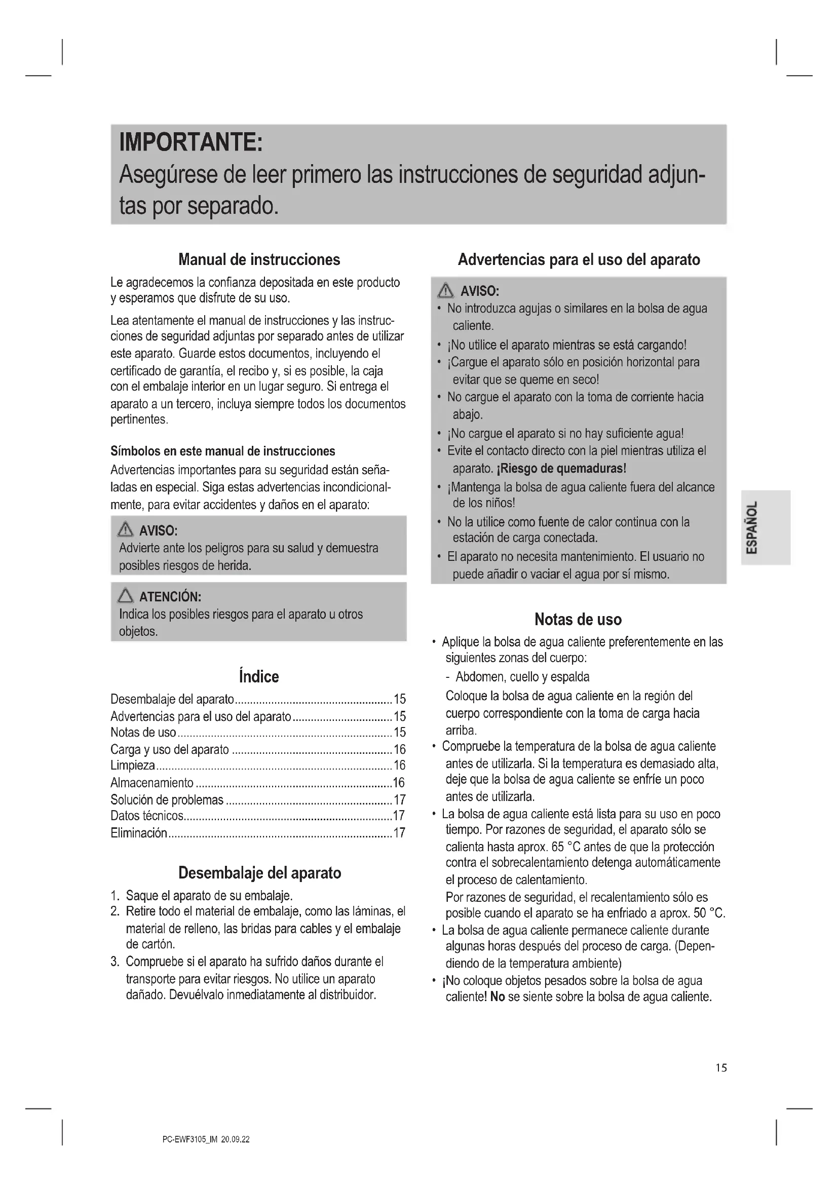 - ¡No coloque objetos pesados sobre la bolsa de agua caliente! No se siente sobre la bolsa de agua caliente.PC-EWF3105_IM 20.09.22
