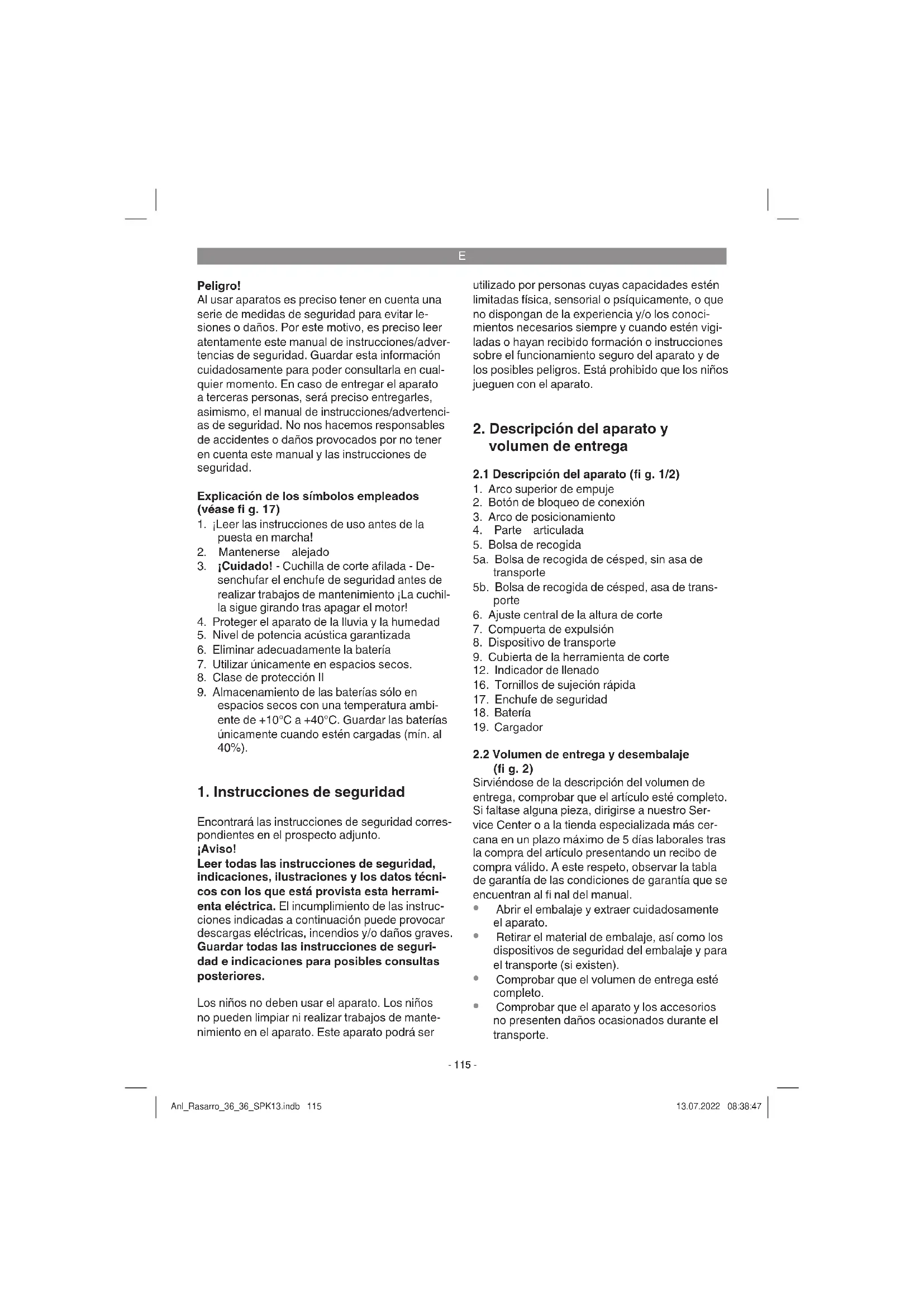 Comprobar regularmente que el dispositivo de recogida de césped no presente señales de desgaste. Anl_Rasarro_36_36_SPK13.indb 120Anl_Rasarro_36_36_SPK13.indb 120 13.07.2022 08:38:4913.07.2022 08:38:49E