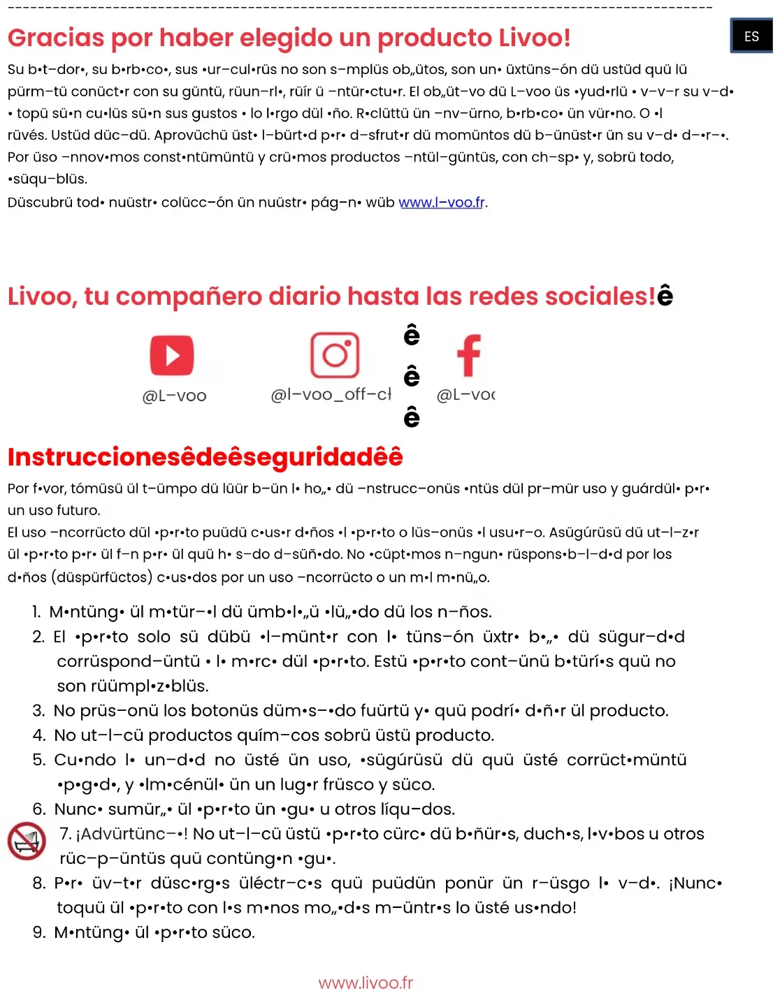 Gracias por haber elegido un producto Livoo! Su batidora, su barbacoa, sus auriculares no son simples objetos, son una extensión de usted que le permite conectar con su gente, reunirla, reír e interactuar. El objetivo de Livoo es ayudarle a vivir su vida a tope sean cuales sean sus gustos a lo largo del año. Raclette en invierno, barbacoa en verano. O al revés. Usted decide. Aproveche esta libertad para disfrutar de momentos de bienestar en su vida diaria. Por eso innovamos constantemente y creamos productos inteligentes, con chispa y, sobre todo, asequibles. Descubre toda nuestra colección en nuestra página web www.livoo.fr.