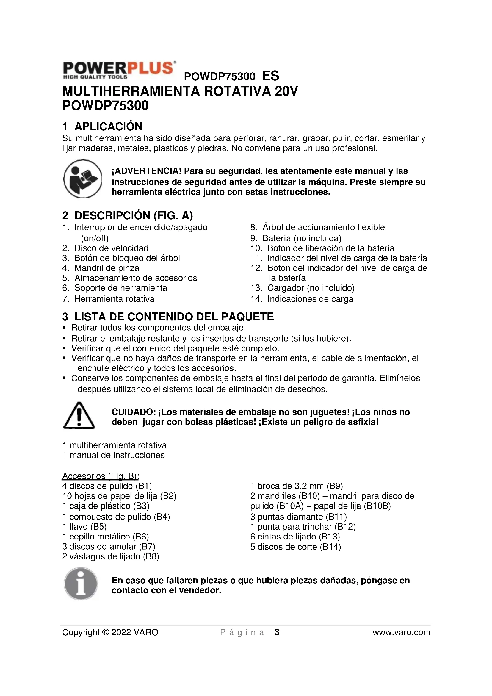 - Conserve los componentes de embalaje hasta el final del periodo de garantía. Elimínelos después utilizando el sistema local de eliminación de desechos. CUIDADO: ¡Los materiales de embalaje no son juguetes! ¡Los niños no deben jugar con bolsas plásticas! ¡Existe un peligro de asfixia! 1 multiherramienta rotativa 1 manual de instrucciones Accesorios (Fig. B): 4 discos de pulido (B1) 10 hojas de papel de lija (B2) 1 caja de plástico (B3) 1 compuesto de pulido (B4) 1 llave (B5) 1 cepillo metálico (B6) 3 discos de amolar (B7) 2 vástagos de lijado (B8) 1 broca de 3,2 mm (B9) 2 mandriles (B10) – mandril para disco de pulido (B10A) + papel de lija (B10B) 3 puntas diamante (B11) 1 punta para trinchar (B12) 6 cintas de lijado (B13) 5 discos de corte (B14) En caso que faltaren piezas o que hubiera piezas dañadas, póngase en contacto con el vendedor.POWDP75300 ES Copyright © 2022 VARO P á g i n a | 4 www.varo.com 4 SÍMBOLOS En este manual y/o en el aparato mismo se utilizan los siguientes símbolos:
