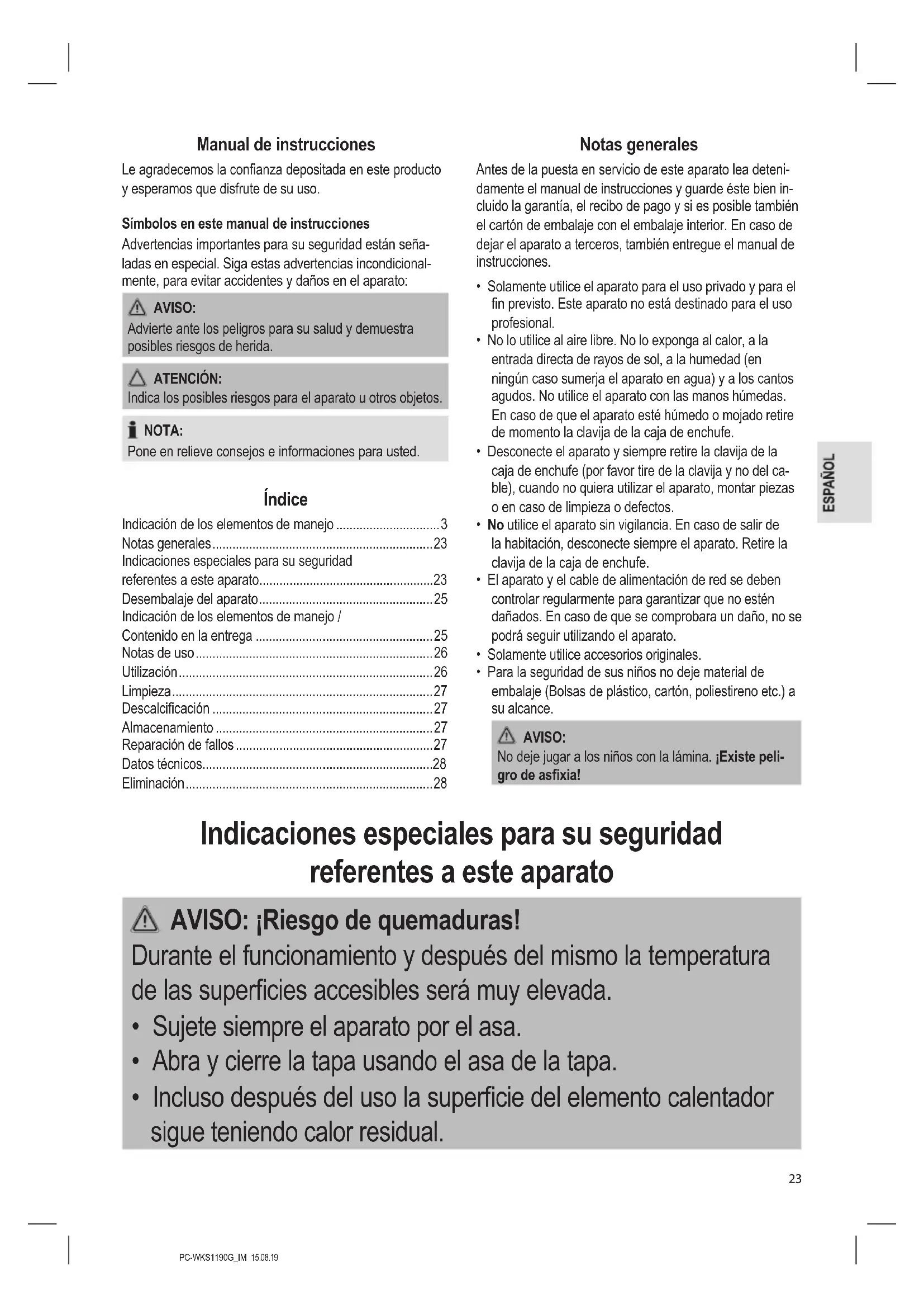 - Manual de instrucciones Le agradecemos la conanza depositada en este producto y esperamos que disfrute de su uso. Símbolos en este manual de instrucciones Advertencias importantes para su seguridad están seña- ladas en especial. Siga estas advertencias incondicional- mente, para evitar accidentes y daños en el aparato: AVISO: Advierte ante los peligros para su salud y demuestra posibles riesgos de herida. ATENCIÓN: Indica los posibles riesgos para el aparato u otros objetos. NOTA: Pone en relieve consejos e informaciones para usted. Índice Indicación de los elementos de manejo p. 3