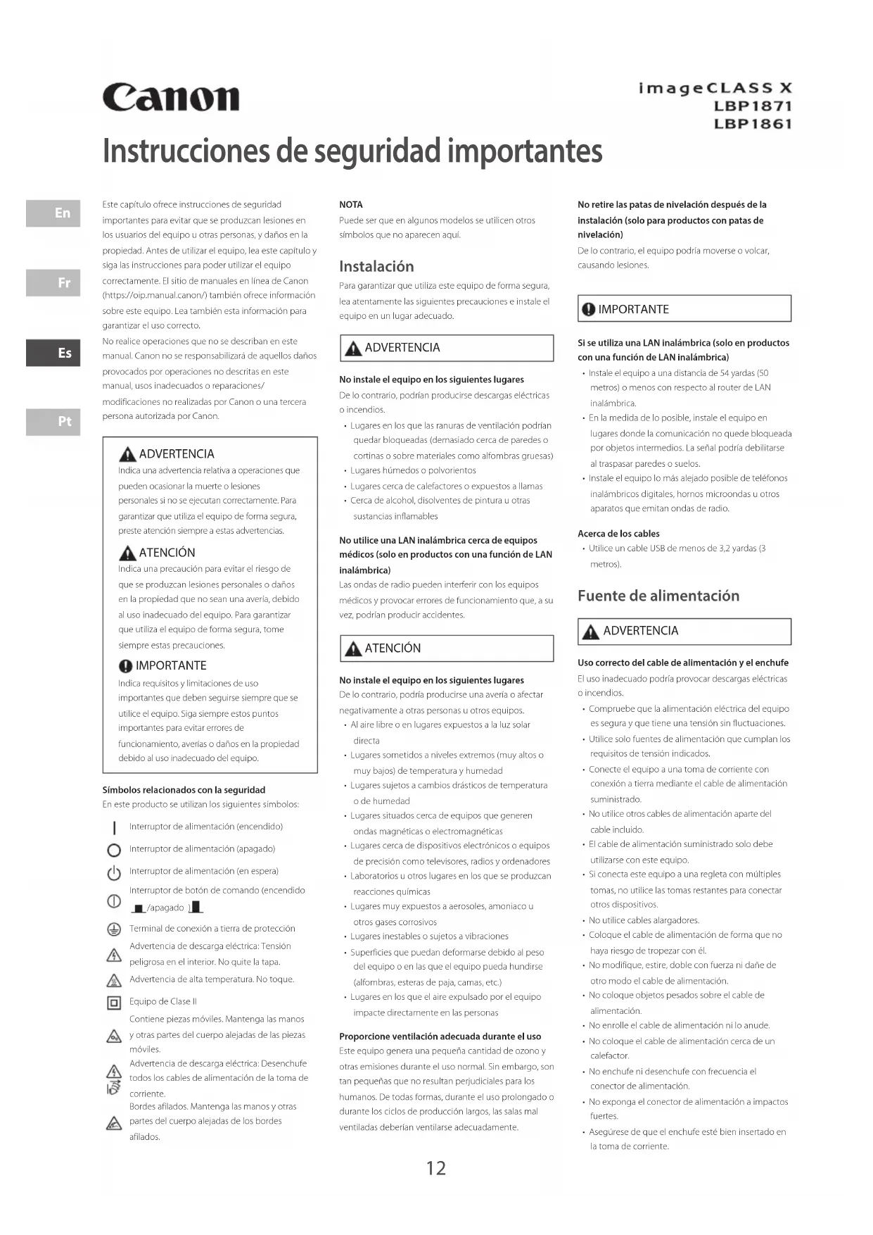 PtInstrucciones de seguridad importantes Este capítulo ofrece instrucciones de seguridad importantes para evitar que se produzcan lesiones en los usuarios del equipo u otras personas, y daños en la propiedad. Antes de utilizar el equipo, lea este capítulo y siga las instrucciones para poder utilizar el equipo correctamente. El sitio de manuales en línea de Canon (https://oip.manual.canon/) también ofrece información sobre este equipo. Lea también esta información para garantizar el uso correcto. No realice operaciones que no se describan en este manual. Canon no se responsabilizará de aquellos daños provocados por operaciones no descritas en este manual, usos inadecuados o reparaciones/modificaciones no realizadas por Canon o una tercera persona autorizada por Canon. ADVERTENCIA Indica una advertencia relativa a operaciones que pueden ocasionar la muerte o lesiones personales si no se ejecutan correctamente. Para garantizar que utiliza el equipo de forma segura, preste atención siempre a estas advertencias. ATENCIÓN Indica una precaución para evitar el riesgo de que se produzcan lesiones personales o daños en la propiedad que no sean una avería, debido al uso inadecuado del equipo. Para garantizar que utiliza el equipo de forma segura, tome siempre estas precauciones. IMPORTANTE Indica requisitos y limitaciones de uso importantes que deben seguirse siempre que se utilice el equipo. Siga siempre estos puntos importantes para evitar errores de funcionamiento, averías o daños en la propiedad debido al uso inadecuado del equipo.Símbolos relacionados con la seguridadEn este producto se utilizan los siguientes símbolos:Interruptor de alimentación (encendido)Interruptor de alimentación (apagado)Interruptor de alimentación (en espera)Interruptor de botón de comando (encendido /apagado )Terminal de conexión a tierra de protecciónAdvertencia de descarga eléctrica: Tensión peligrosa en el interior. No quite la tapa.Advertencia de alta temperatura. No toque.Equipo de Clase IIContiene piezas móviles. Mantenga las manos y otras partes del cuerpo alejadas de las piezas móviles.Advertencia de descarga eléctrica: Desenchufe todos los cables de alimentación de la toma de corriente.Bordes afilados. Mantenga las manos y otras partes del cuerpo alejadas de los bordes afilados. NOTA Puede ser que en algunos modelos se utilicen otros símbolos que no aparecen aquí. Instalación Para garantizar que utiliza este equipo de forma segura, lea atentamente las siguientes precauciones e instale el equipo en un lugar adecuado. ADVERTENCIA No instale el equipo en los siguientes lugaresDe lo contrario, podrían producirse descargas eléctricas o incendios.• Lugares en los que las ranuras de ventilación podrían quedar bloqueadas (demasiado cerca de paredes o cortinas o sobre materiales como alfombras gruesas)• Lugares húmedos o polvorientos• Lugares cerca de calefactores o expuestos a llamas• Cerca de alcohol, disolventes de pintura u otras sustancias inflamablesNo utilice una LAN inalámbrica cerca de equipos médicos (solo en productos con una función de LAN inalámbrica)Las ondas de radio pueden interferir con los equipos médicos y provocar errores de funcionamiento que, a su vez, podrían producir accidentes. ATENCIÓN No instale el equipo en los siguientes lugaresDe lo contrario, podría producirse una avería o afectar negativamente a otras personas u otros equipos.• Al aire libre o en lugares expuestos a la luz solar directa• Lugares sometidos a niveles extremos (muy altos o muy bajos) de temperatura y humedad• Lugares sujetos a cambios drásticos de temperatura o de humedad• Lugares situados cerca de equipos que generen ondas magnéticas o electromagnéticas• Lugares cerca de dispositivos electrónicos o equipos de precisión como televisores, radios y ordenadores• Laboratorios u otros lugares en los que se produzcan reacciones químicas• Lugares muy expuestos a aerosoles, amoniaco u otros gases corrosivos• Lugares inestables o sujetos a vibraciones• Superficies que puedan deformarse debido al peso del equipo o en las que el equipo pueda hundirse (alfombras, esteras de paja, camas, etc.)• Lugares en los que el aire expulsado por el equipo impacte directamente en las personasProporcione ventilación adecuada durante el usoEste equipo genera una pequeña cantidad de ozono y otras emisiones durante el uso normal. Sin embargo, son tan pequeñas que no resultan perjudiciales para los humanos. De todas formas, durante el uso prolongado o durante los ciclos de producción largos, las salas mal ventiladas deberían ventilarse adecuadamente.No retire las patas de nivelación después de la instalación (solo para productos con patas de nivelación)De lo contrario, el equipo podría moverse o volcar, causando lesiones. IMPORTANTE Si se utiliza una LAN inalámbrica (solo en productos con una función de LAN inalámbrica)• Instale el equipo a una distancia de 54 yardas (50 metros) o menos con respecto al router de LAN inalámbrica. • En la medida de lo posible, instale el equipo en lugares donde la comunicación no quede bloqueada por objetos intermedios. La señal podría debilitarse al traspasar paredes o suelos. • Instale el equipo lo más alejado posible de teléfonos inalámbricos digitales, hornos microondas u otros aparatos que emitan ondas de radio.Acerca de los cables• Utilice un cable USB de menos de 3,2 yardas (3 metros). Fuente de alimentación ADVERTENCIA Uso correcto del cable de alimentación y el enchufeEl uso inadecuado podría provocar descargas eléctricas o incendios. • Compruebe que la alimentación eléctrica del equipo es segura y que tiene una tensión sin fluctuaciones.• Utilice solo fuentes de alimentación que cumplan los requisitos de tensión indicados.• Conecte el equipo a una toma de corriente con conexión a tierra mediante el cable de alimentación suministrado.• No utilice otros cables de alimentación aparte del