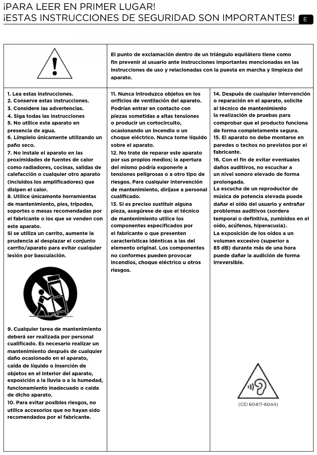 daños auditivos, no escuchar a un nivel sonoro elevado de forma prolongada. La escucha de un reproductor de música de potencia elevada puede dañar el oído del usuario y entrañar problemas auditivos (sordera temporal o definitiva, zumbidos en el oído, acúfenos, hiperacusia). La exposición de los oídos a un volumen excesivo (superior a 85 dB) durante más de una hora puede dañar la audición de forma irreversible. (CEI 60417-6044)21 SPECTRAL 40
