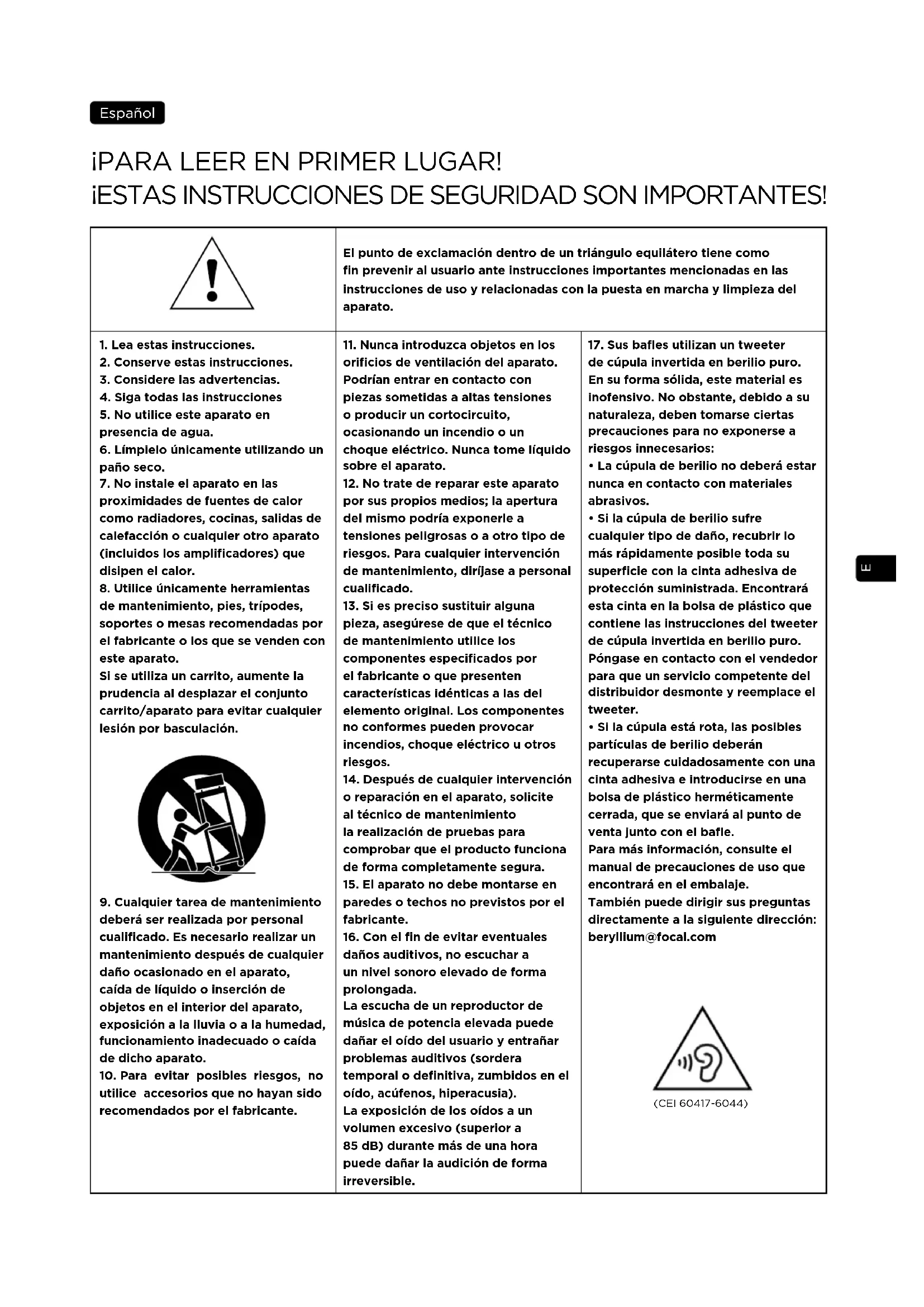 - Si la cúpula está rota, las posibles partículas de berilio deberán recuperarse cuidadosamente con una cinta adhesiva e introducirse en una bolsa de plástico herméticamente cerrada, que se enviará al punto de venta junto con el bafle. Para más información, consulte el manual de precauciones de uso que encontrará en el embalaje. También puede dirigir sus preguntas directamente a la siguiente dirección: beryllium@focal.com (CEI 60417-6044)24 SCALA UTOPIA