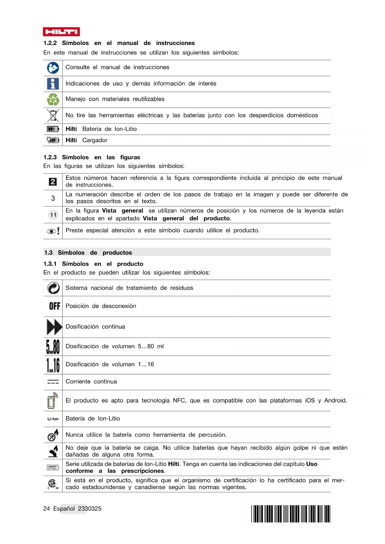 En el producto se pueden utilizar los siguientes símbolos: Sistema nacional de tratamiento de residuos Posición de desconexión Dosificación continua Dosificación de volumen 5…80 ml Dosificación de volumen 1…16 Corriente continua El producto es apto para tecnología NFC, que es compatible con las plataformas iOS y Android. Batería de Ion-Litio Nunca utilice la batería como herramienta de percusión. No deje que la batería se caiga. No utilice baterías que hayan recibido algún golpe ni que estén dañadas de alguna otra forma. Serie utilizada de baterías de Ion-Litio Hilti. Tenga en cuenta las indicaciones del capítulo Uso conforme a las prescripciones. Si está en el producto, significa que el organismo de certificación lo ha certificado para el mer- cado estadounidense y canadiense según las normas vigentes.*2330325* 2330325 Español 25