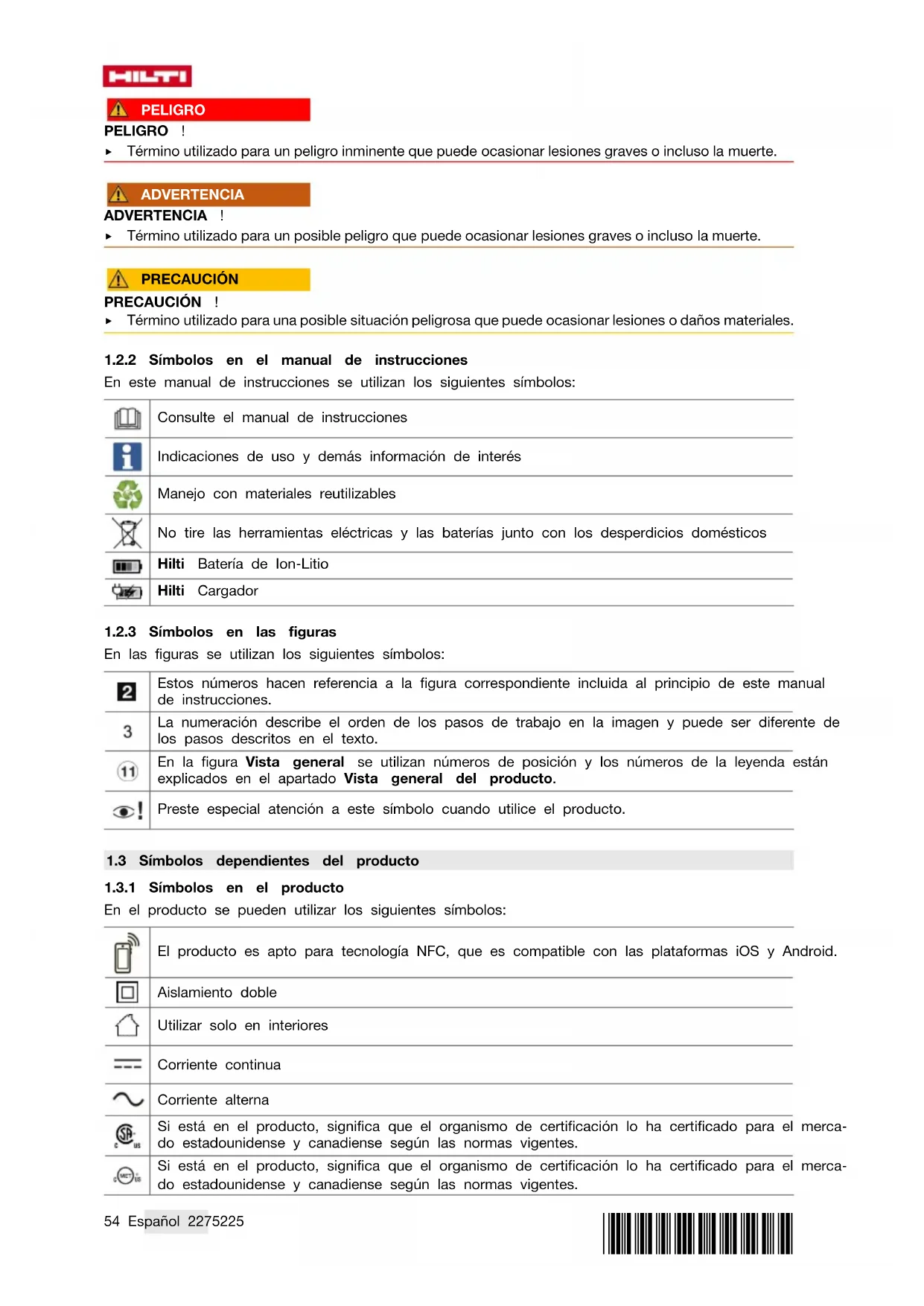 - No utilice el producto si presenta daños o fallos que afecten al funcionamiento. Llévela de inmediato al Servicio Técnico de Hilti para que la reparen.*2275225* 2275225 Español 59