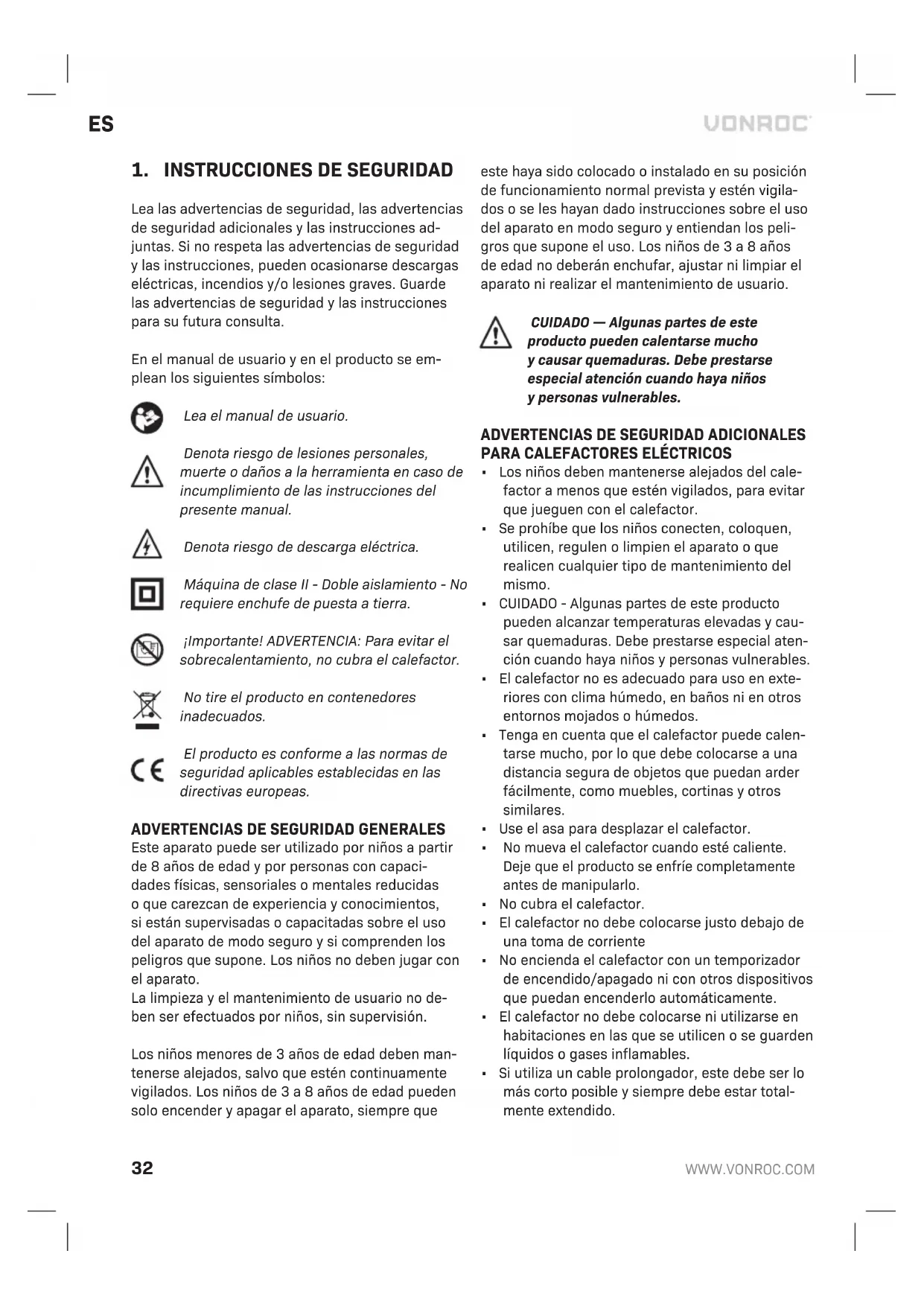 Lea las advertencias de seguridad, las advertencias de seguridad adicionales ylas instrucciones ad- juntas. Si no respeta las advertencias de seguridad ylas instrucciones, pueden ocasionarse descargas eléctricas, incendios y/olesiones graves. Guarde las advertencias de seguridad ylas instrucciones para su futura consulta. En el manual de usuario yen el producto se em- plean los siguientes símbolos: Lea el manual de usuario. Denota riesgo de lesiones personales, muerte odaños ala herramienta en caso de incumplimiento de las instrucciones del presente manual. Denota riesgo de descarga eléctrica. Máquina de clase II - Doble aislamiento - No requiere enchufe de puesta atierra. ¡Importante! ADVERTENCIA: Para evitar el sobrecalentamiento, no cubra el calefactor. No tire el producto en contenedores inadecuados. El producto es conforme alas normas de seguridad aplicables establecidas en las directivas europeas.