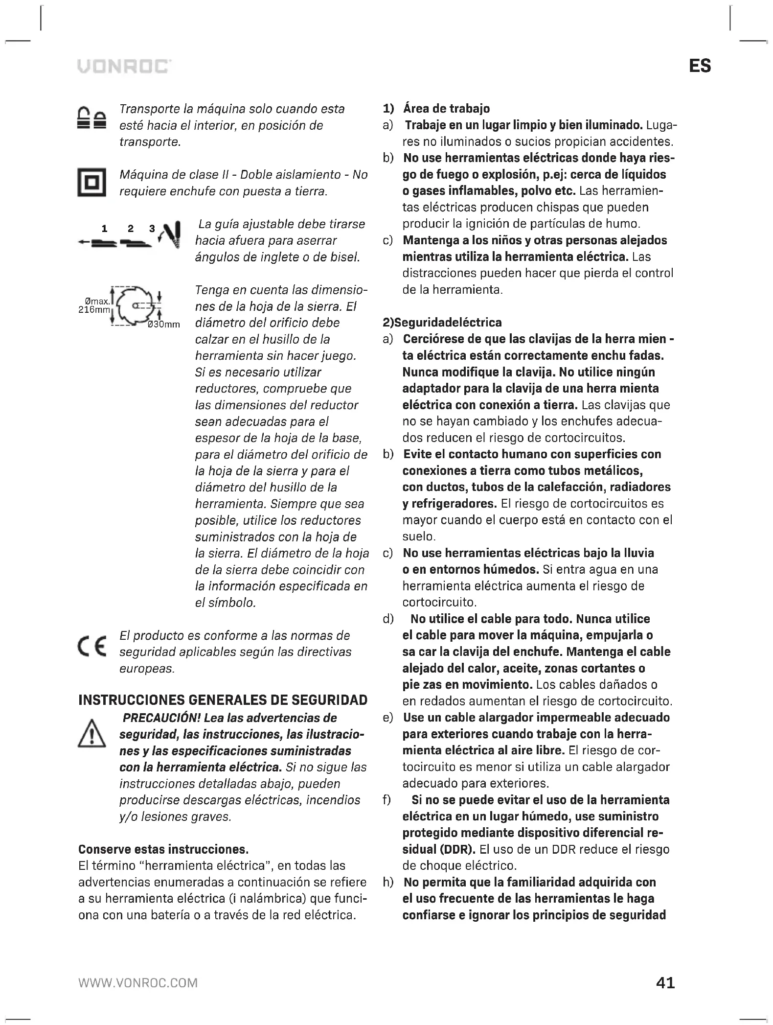 La guía ajustable debe tirarse hacia afuera para aserrar ángulos de inglete o de bisel. Ø30mm Ømax. 216mm Tenga en cuenta las dimensio- nes de la hoja de la sierra. El diámetro del orificio debe calzar en el husillo de la herramienta sin hacer juego. Si es necesario utilizar reductores, compruebe que las dimensiones del reductor sean adecuadas para el espesor de la hoja de la base, para el diámetro del orificio de la hoja de la sierra y para el diámetro del husillo de la herramienta. Siempre que sea posible, utilice los reductores suministrados con la hoja de la sierra. El diámetro de la hoja de la sierra debe coincidir con la información especificada en el símbolo. El producto es conforme a las normas de seguridad aplicables según las directivas europeas.