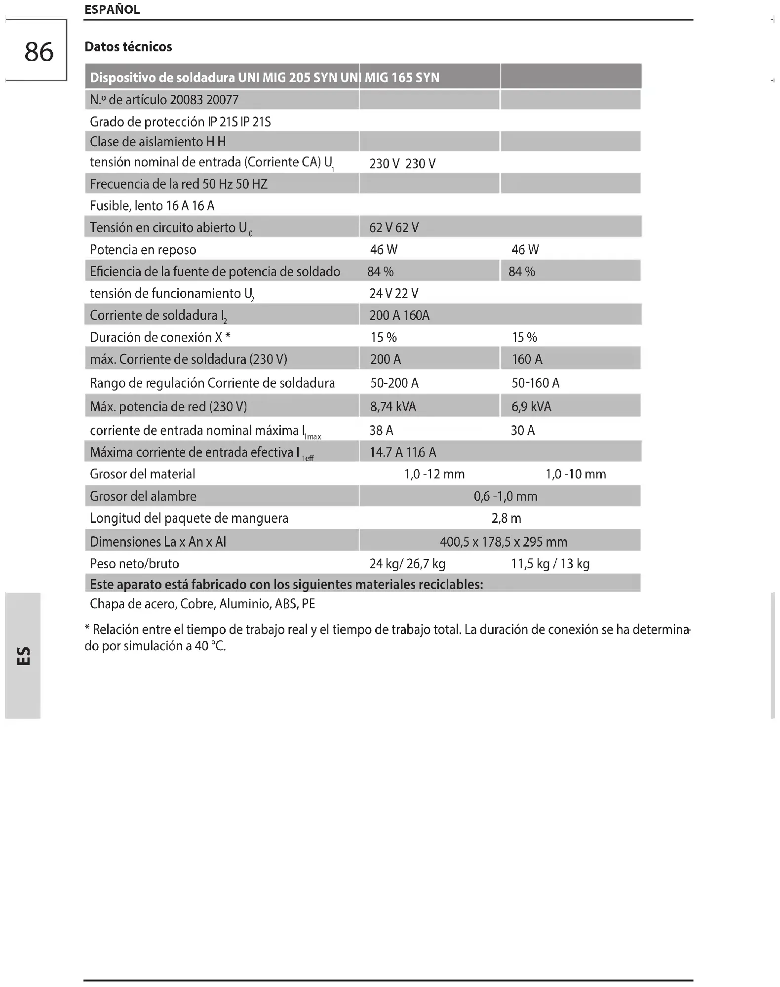 ESPAÑOL Datos técnicos Dispositivo de soldadura UNI MIG 205 SYN UNI MIG 165 SYN N.º de artículo 20083 20077 Grado de protección IP 21S IP 21S Clase de aislamiento H H tensión nominal de entrada (Corriente CA) U