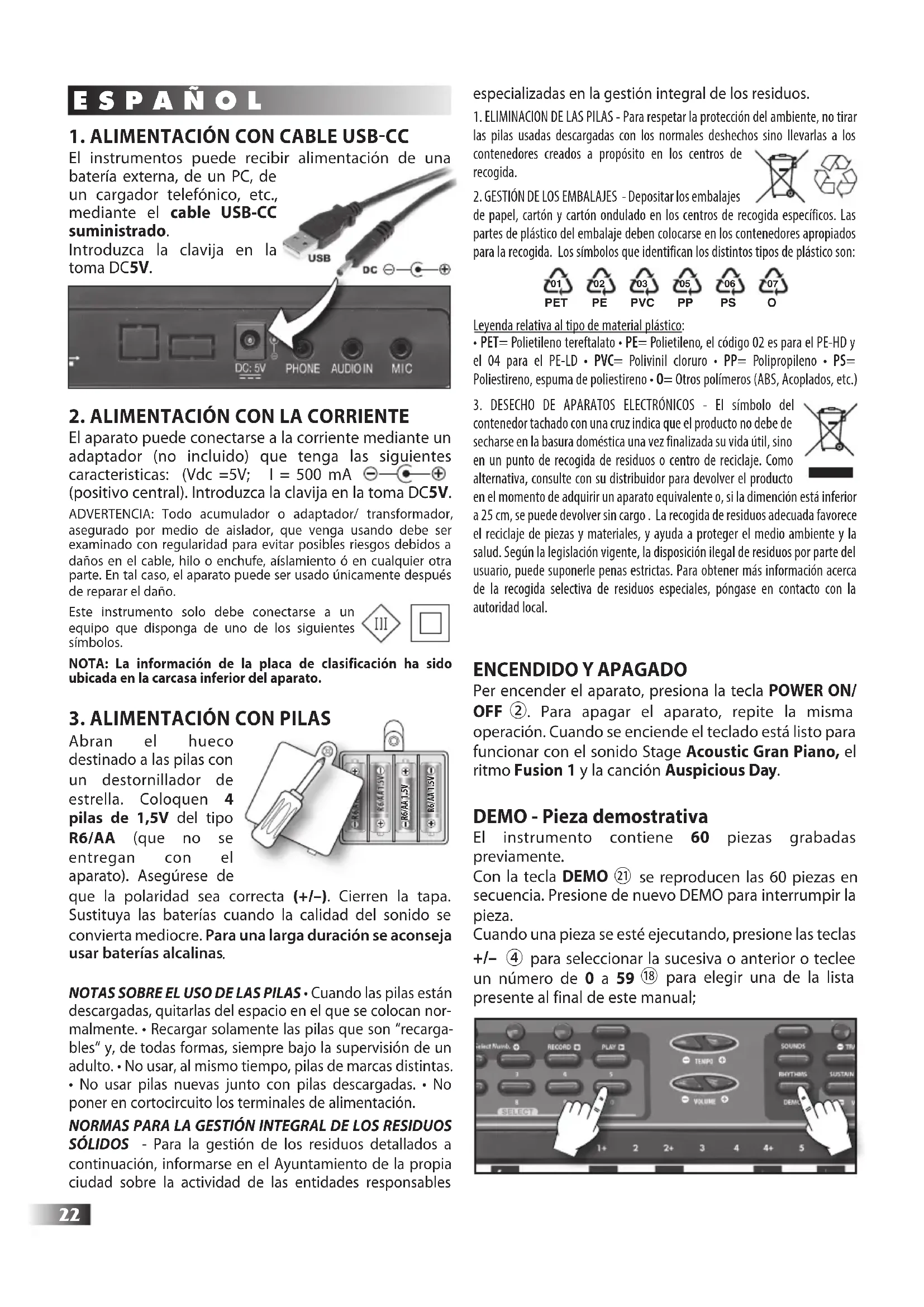 Per encender el aparato, presiona la tecla POWER ON/ OFF ②. Para apagar el aparato, repite la misma operación. Cuando se enciende el teclado está listo para funcionar con el sonido Stage Acoustic Gran Piano, el ritmo Fusion 1 y la canción Auspicious Day. DEMO - Pieza demostrativa El instrumento contiene 60 piezas grabadas previamente. Con la tecla DEMO ㉑ se reproducen las 60 piezas en secuencia. Presione de nuevo DEMO para interrumpir la pieza. Cuando una pieza se esté ejecutando, presione las teclas