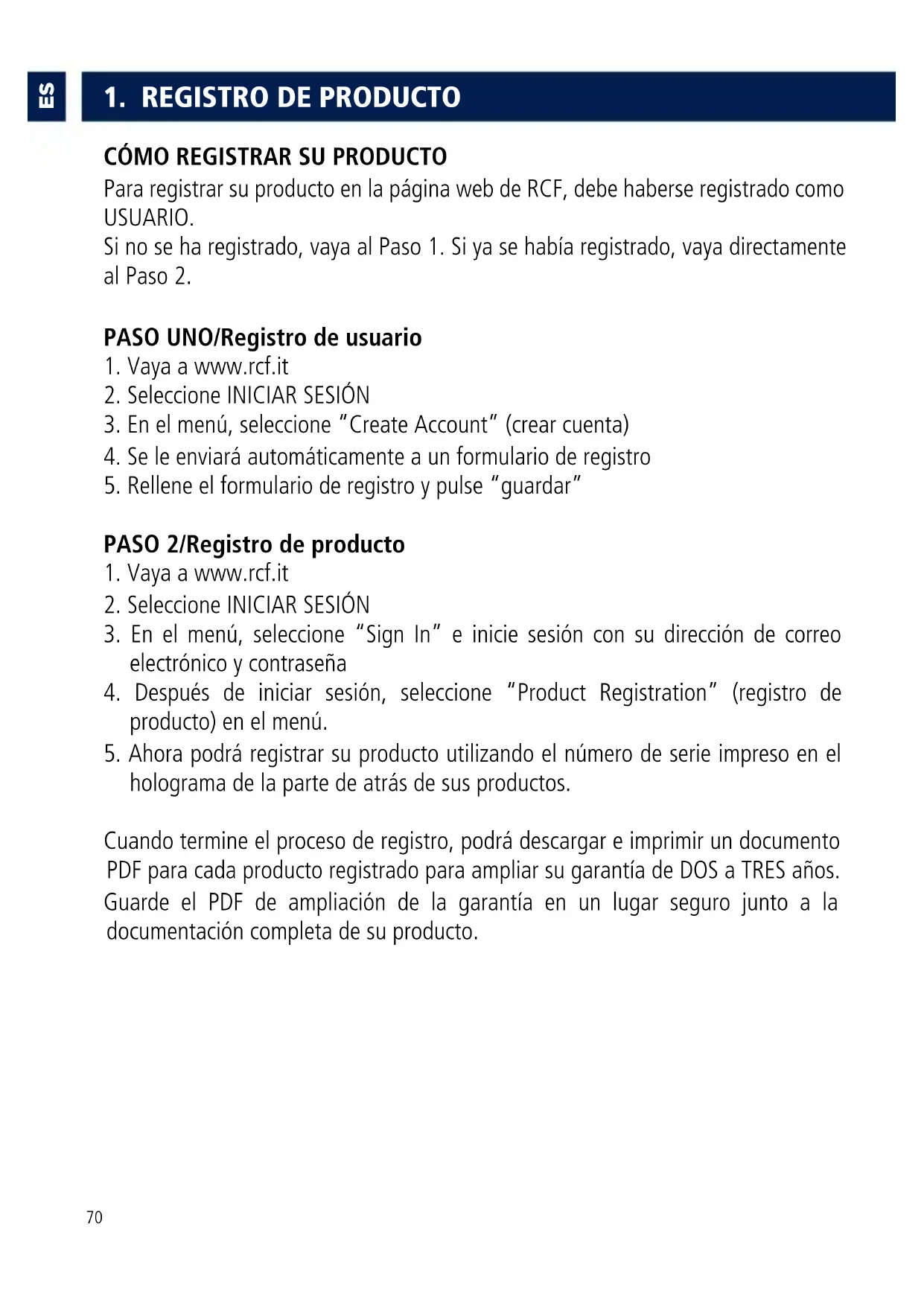 La garantía de RCF será válida durante un periodo de dos (2) años a partir de la fecha de compra indicada en el tícket o factura. Le rogamos que guarde este documento, junto con la prueba de compra, en un lugar seguro. Deberá presentar toda la documentación para aprovechar por completo la garantía. UN AÑO ADICIONAL DE GARANTÍA REGISTRE SU PRODUCTO ONLINE PARA OBTENER UN AÑO