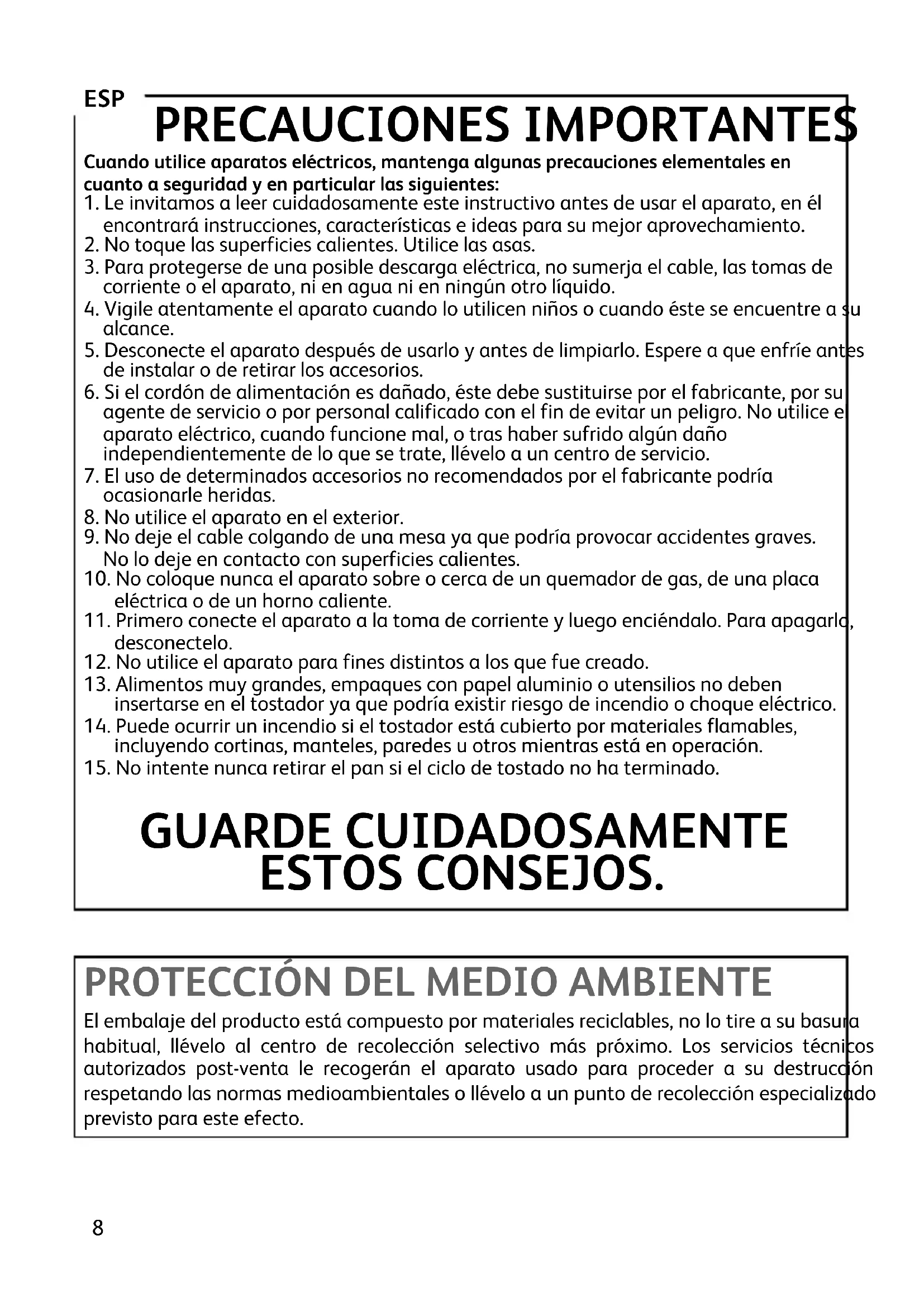 FRA 7PRECAUCIONES IMPORTANTES Cuando utilice aparatos eléctricos, mantenga algunas precauciones elementales encuanto a seguridad y en particular las siguientes:
