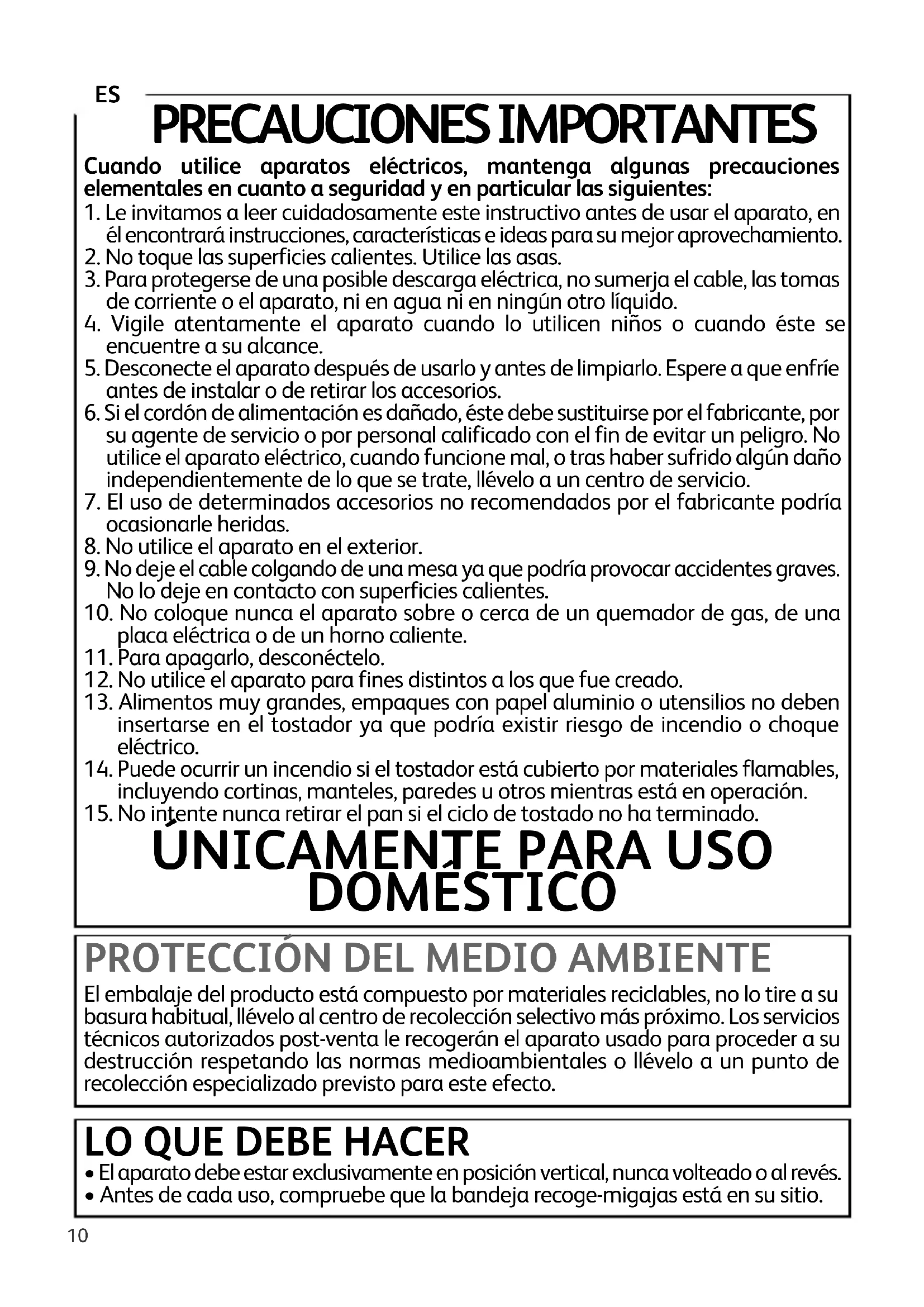 IFU_TF_TOASTER_NC00025535_IFU-T-FAL-FULL-INOX 08/09/11 12:12 Page910 PRECAUCIONES IMPORTANTES Cuando utilice aparatos eléctricos, mantenga algunas precauciones elementales en cuanto a seguridad y en particular las siguientes:
