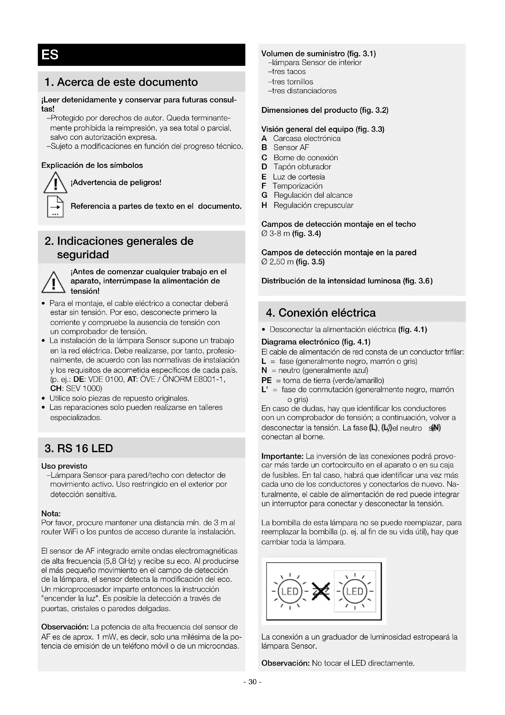 Uso previsto – Lámpara Sensor-para pared/techo con detector de movimiento activo. Uso restringido en el exterior por detección sensitiva. Nota: Por favor, procure mantener una distancia mín. de 3 m al router WiFi o los puntos de acceso durante la instalación. El sensor de AF integrado emite ondas electromagnéticas de alta frecuencia (5,8 GHz) y recibe su eco. Al producirse el más pequeño movimiento en el campo de detección de la lámpara, el sensor detecta la modificación del eco. Un microprocesador imparte entonces la instrucción "encender la luz". Es posible la detección a través de puertas, cristales o paredes delgadas. Observación: La potencia de alta frecuencia del sensor de AF es de aprox. 1 mW, es decir, solo una milésima de la po- tencia de emisión de un teléfono móvil o de un microondas.- 31 -