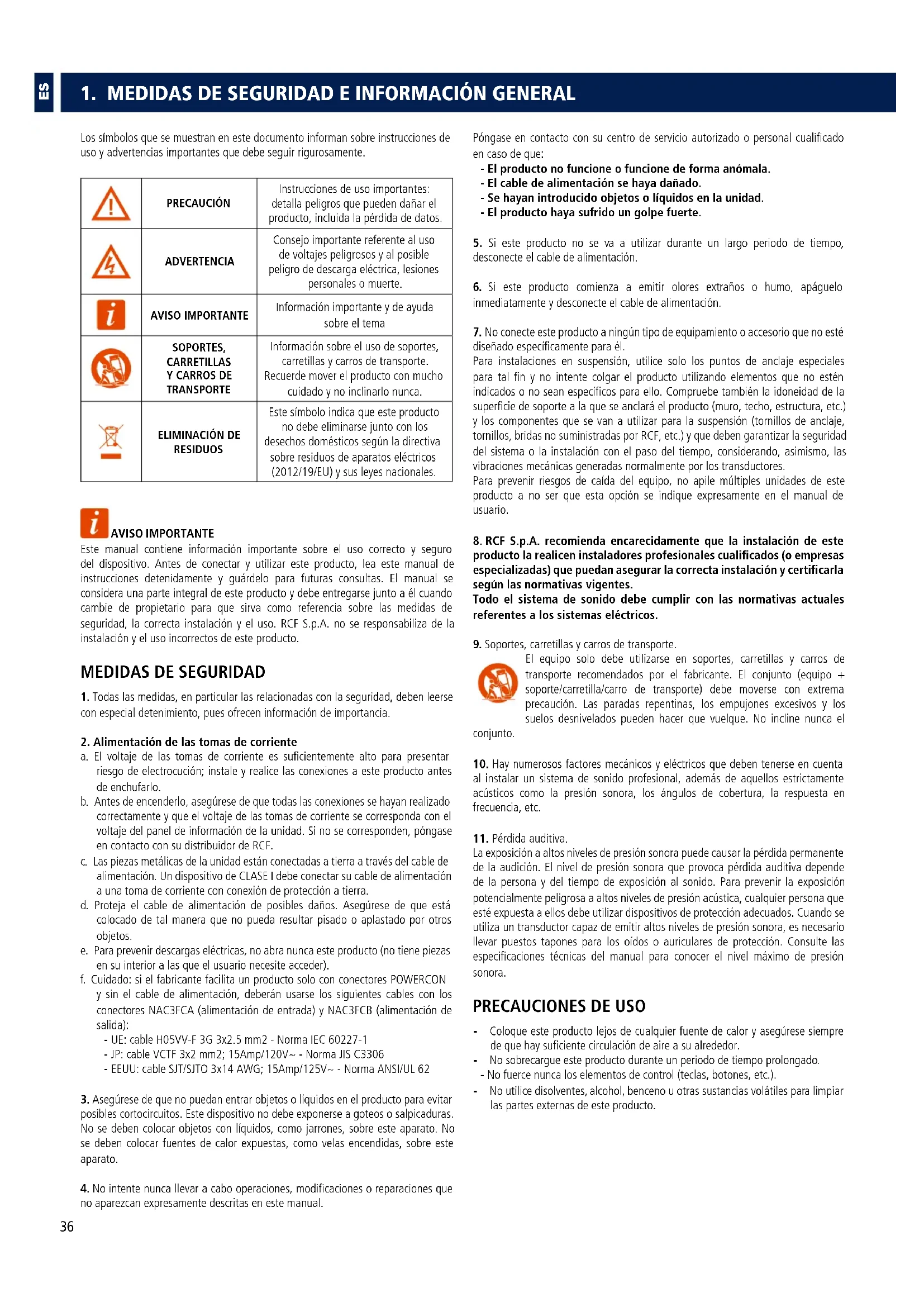 Este símbolo indica que este producto no debe eliminarse junto con los desechos domésticos según la directiva sobre residuos de aparatos eléctricos (2012/19/EU) y sus leyes nacionales. AVISO IMPORTANTE Este manual contiene información importante sobre el uso correcto y seguro del dispositivo. Antes de conectar y utilizar este producto, lea este manual de instrucciones detenidamente y guárdelo para futuras consultas. El manual se considera una parte integral de este producto y debe entregarse junto a él cuando cambie de propietario para que sirva como referencia sobre las medidas de seguridad, la correcta instalación y el uso. RCF S.p.A. no se responsabiliza de la instalación y el uso incorrectos de este producto.