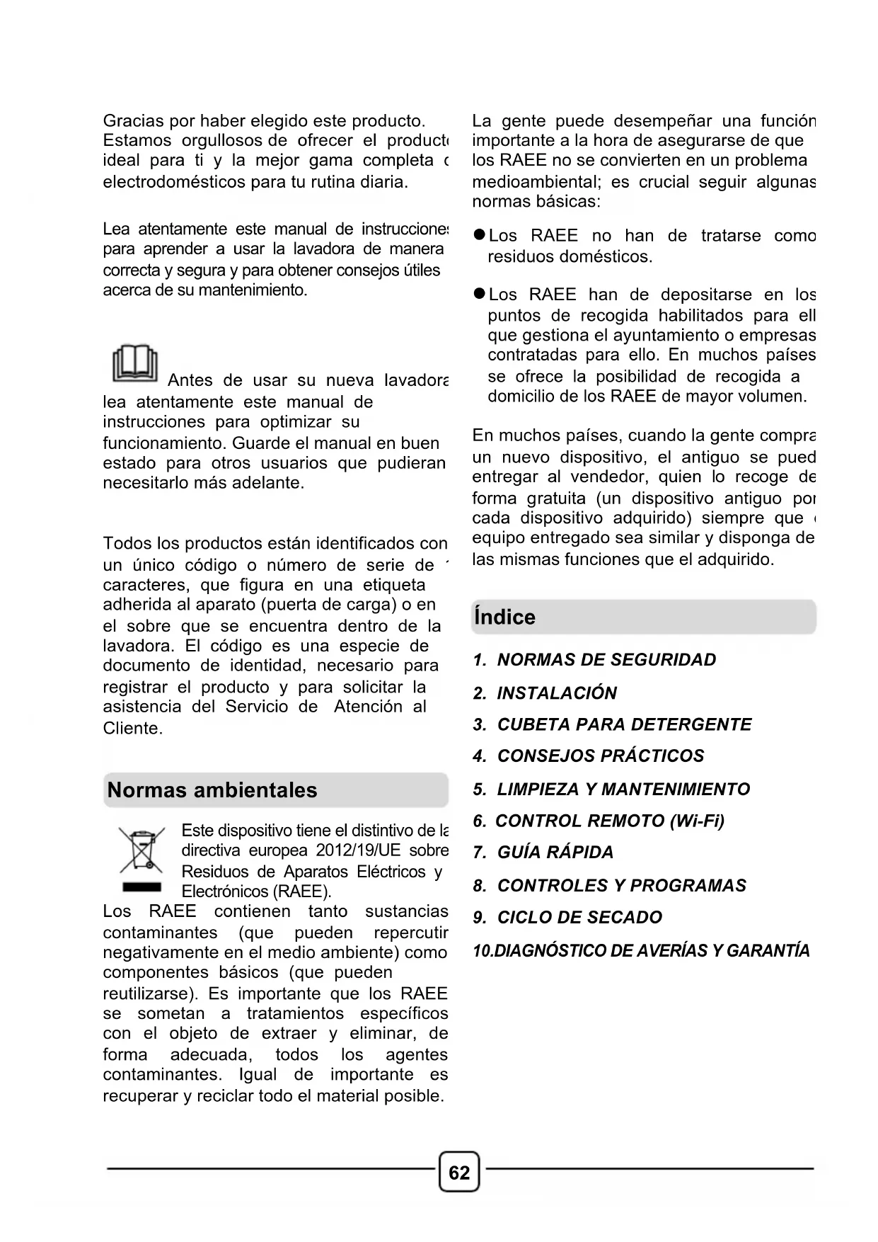 Gracias por haber elegido este producto. Estamos orgullosos de ofrecer el producto ideal para ti y la mejor gama completa de electrodomésticos para tu rutina diaria. Lea atentamente este manual de instrucciones para aprender a usar la lavadora de manera correcta y segura y para obtener consejos útiles acerca de su mantenimiento. Antes de usar su nueva lavadora, lea atentamente este manual de instrucciones para optimizar su funcionamiento. Guarde el manual en buen estado para otros usuarios que pudieran necesitarlo más adelante. Todos los productos están identificados con un único código o número de serie de 16 caracteres, que figura en una etiqueta adherida al aparato (puerta de carga) o en el sobre que se encuentra dentro de la lavadora. El código es una especie de documento de identidad, necesario para registrar el producto y para solicitar la asistencia del Servicio de Atención al Cliente.