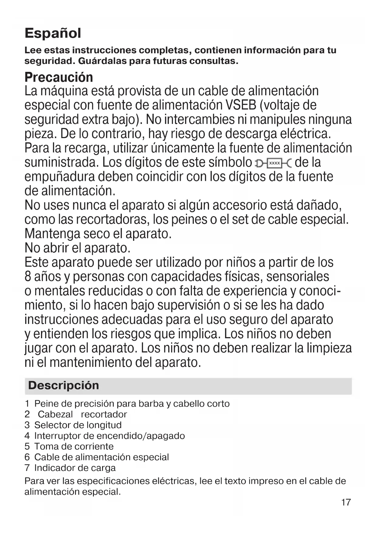 - El indicador de carga (7) del cable de alimentación especial se enciende continuamente cuando el aparato se está cargando.